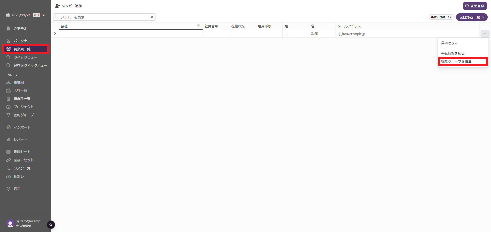 - メンバーの所属グループ(組織、会社、事業所、プロジェクト)を変更する。