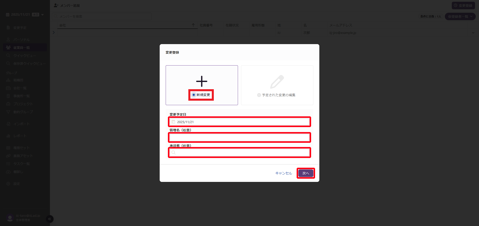 2.「新規変更」を選択の上、以下の項目を設定し、「次へ」をクリックします。