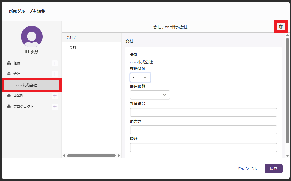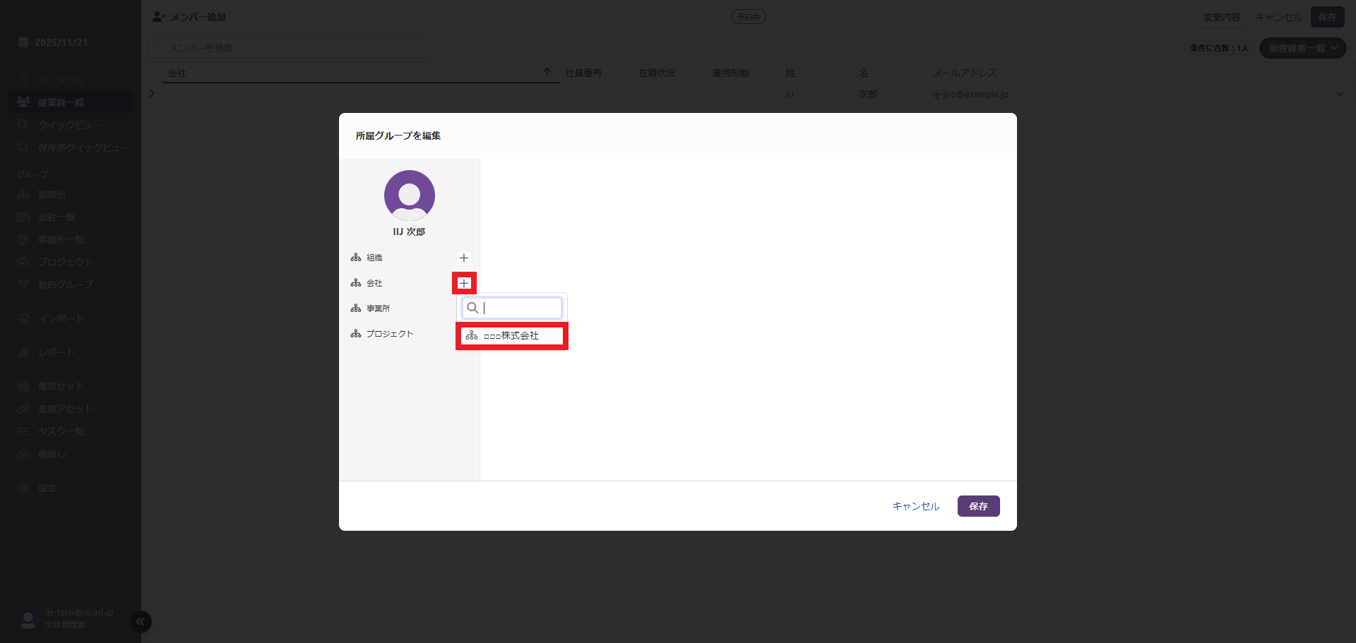 3.所属するグループ種別「(例:会社)」の右にある「+」をクリックし、所属するグループ「(例:株式会社 ○○○)」を選択します。