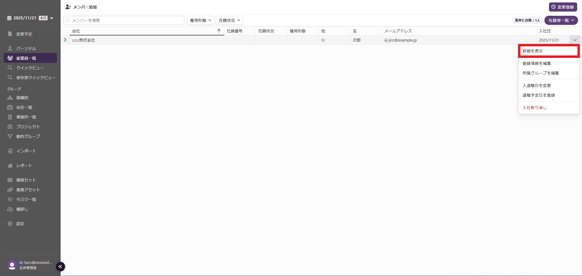 9.「従業員一覧」をクリックし、プルダウンメニューから「詳細を表示」を選択します。