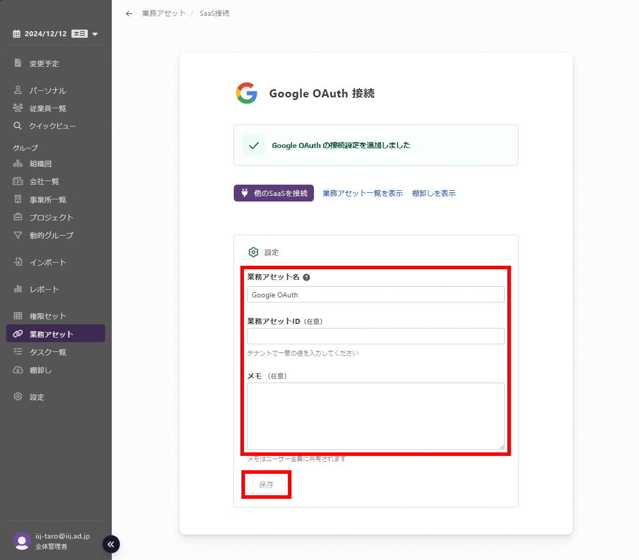 接続結果画面で業務アセットに関する以下の設定を行えます。設定項目を入力後、「保存」をクリックします。