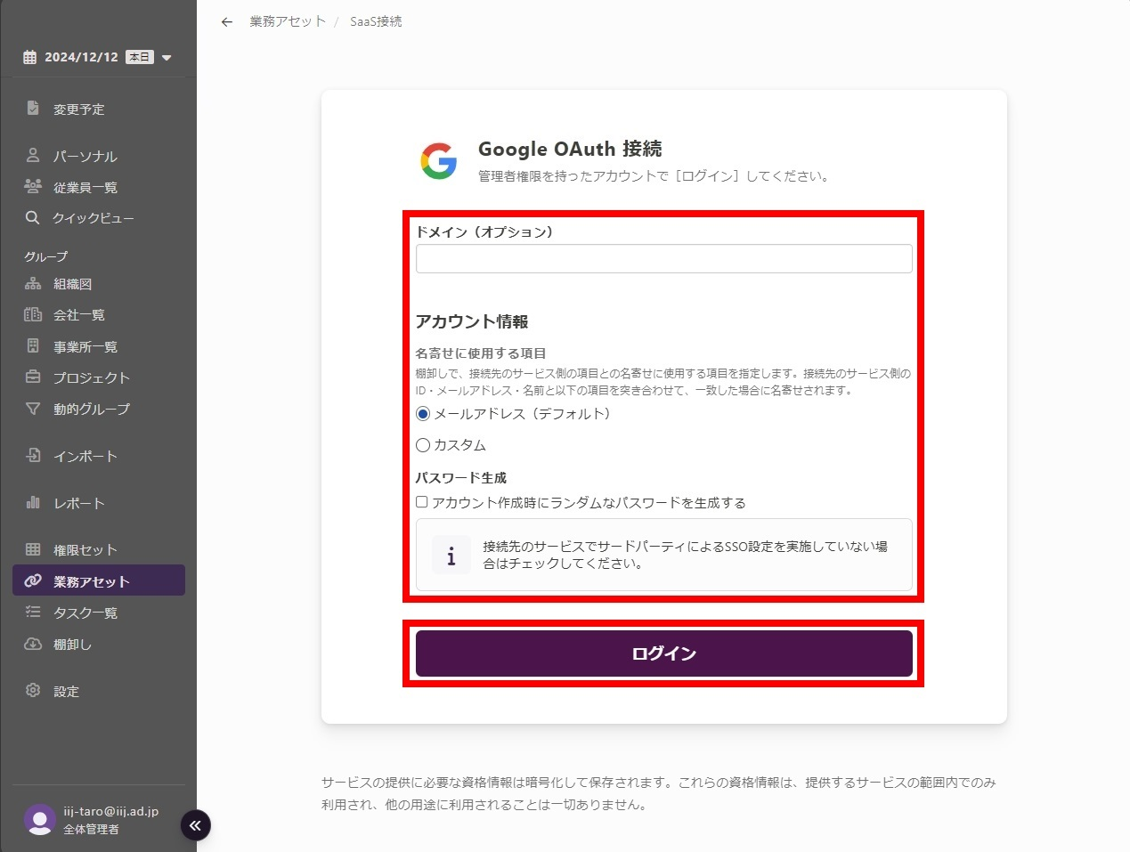 4.以下の情報を入力し、「ログイン」をクリックします。