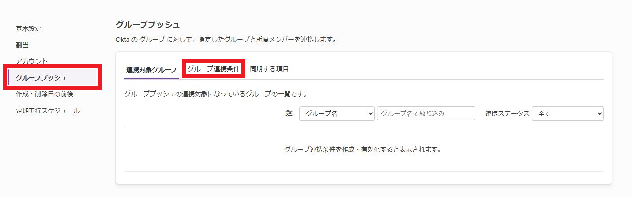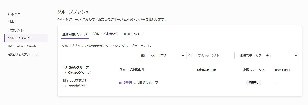 同期対象のグループ(会社、組織、事業所、プロジェクト、及び動的グループ)を設定する「グループプッシュ」の設定方法を、Oktaの業務アセット設定画面を例に説明します。