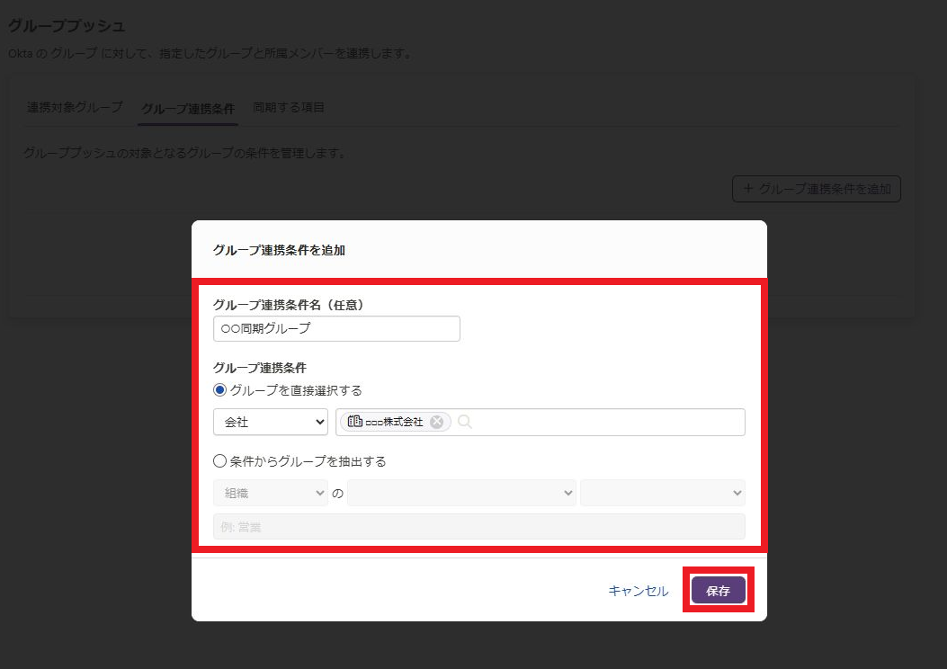 4.「グループ連携条件名」(任意)と「グループ連携条件」(必須)を入力し、「保存」をクリックします。