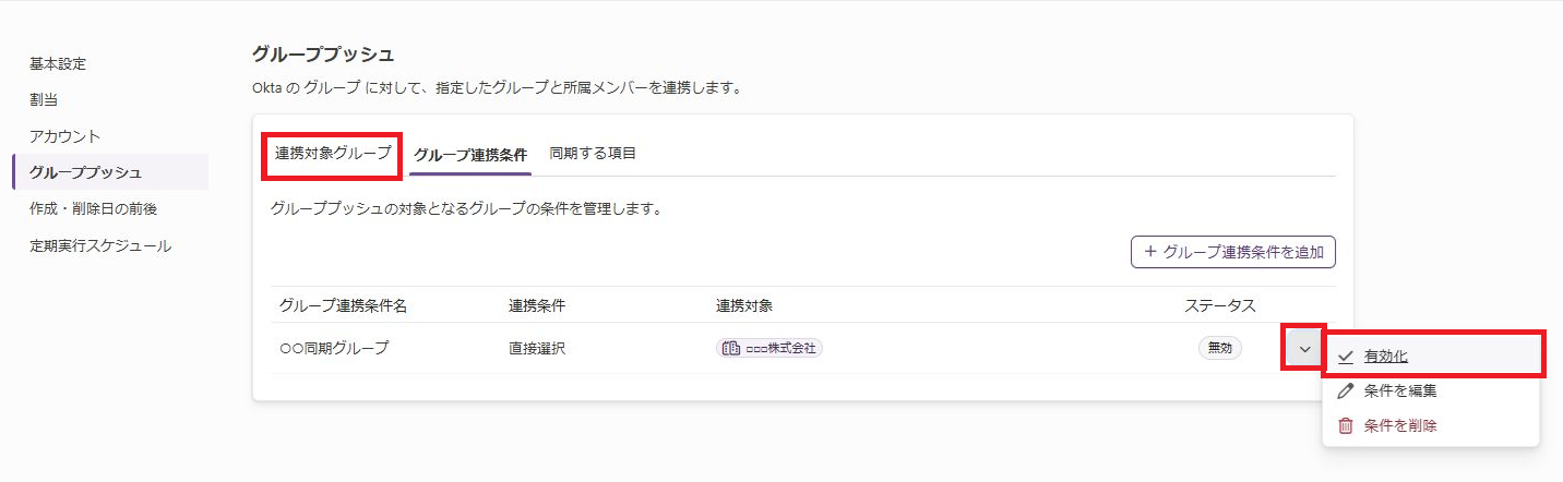 5.作成されたグループ連携条件の行にあるプルダウンメニューから「有効化」を選択し、「連携対象グループ」タブをクリックします。