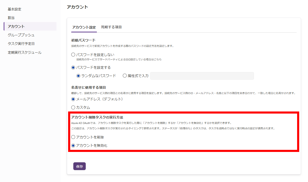 ※1:アカウント削除時の処理設定は「業務アセット」の「アカウント」-「アカウント設定」タブで行えます。