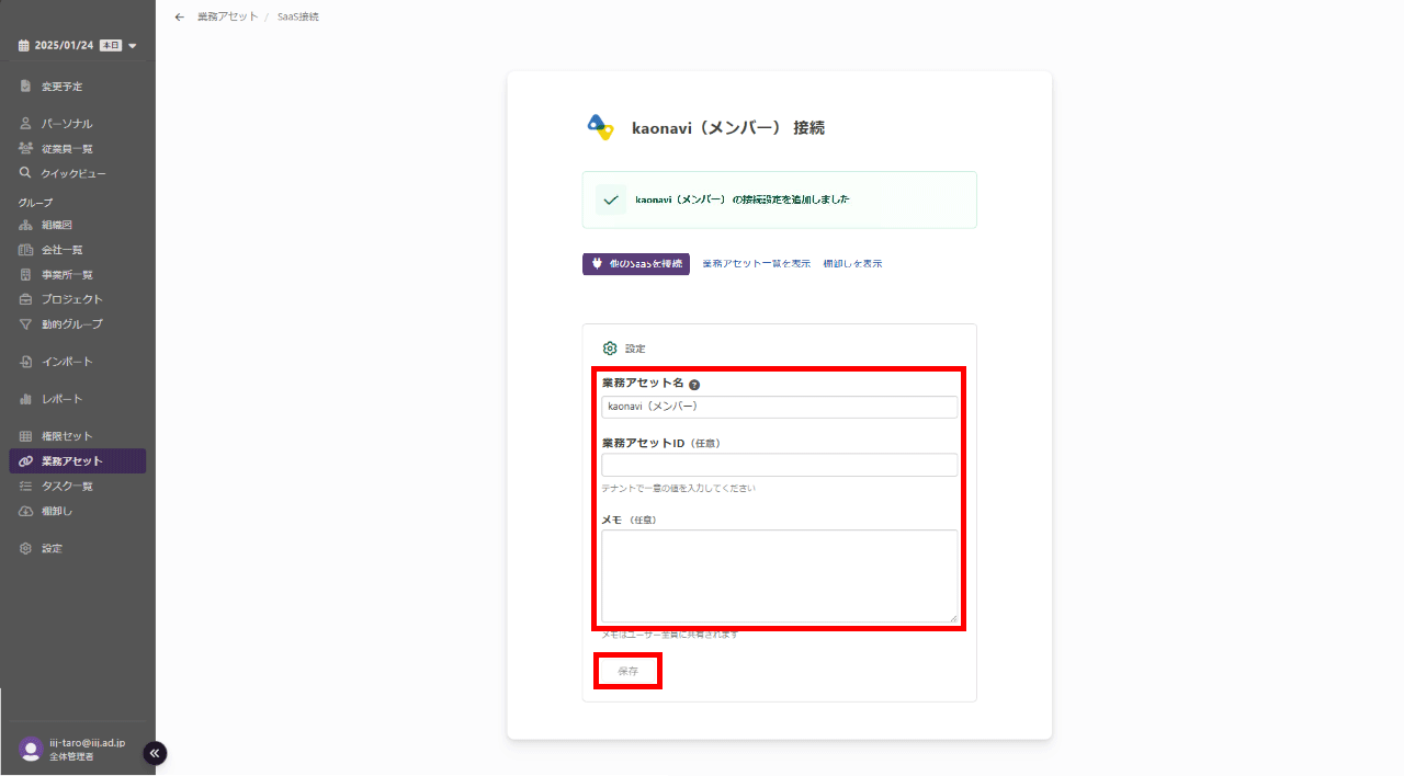 接続結果画面で業務アセットに関する下記の設定を行えます。設定項目を入力後、「保存」をクリックします。