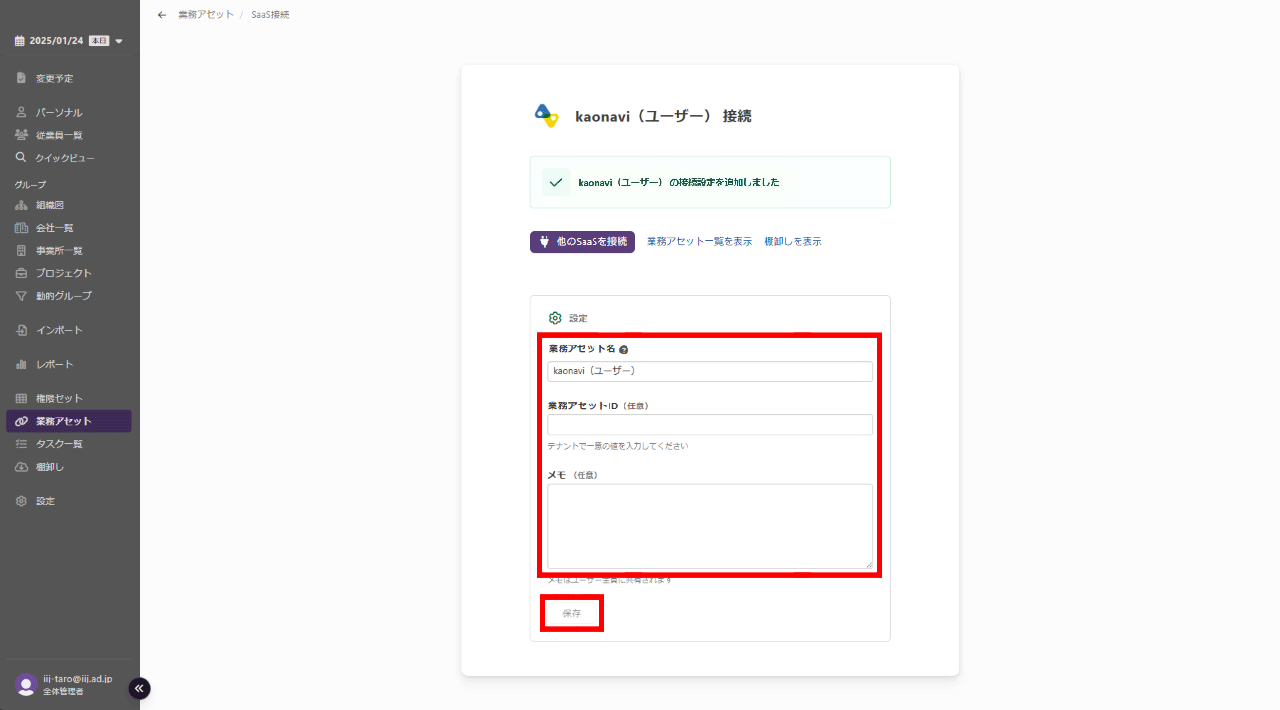 接続結果画面で業務アセットに関する以下の設定を行えます。設定項目を入力後、「保存」をクリックします。