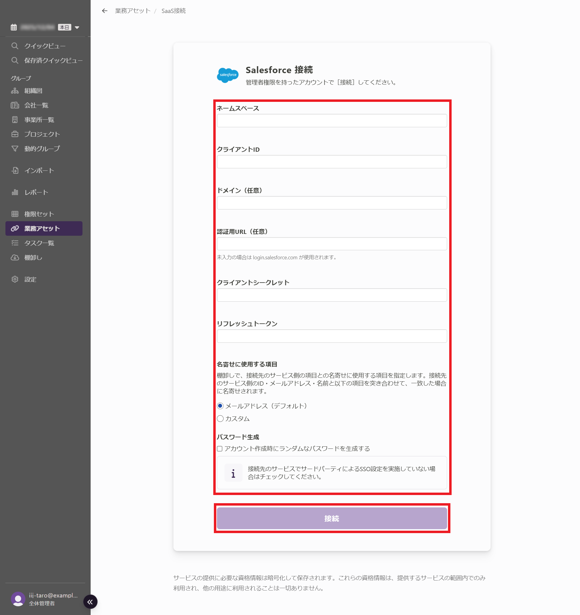 接続結果画面で業務アセットに関する以下の設定を行えます。設定項目を入力後、「保存」をクリックします。