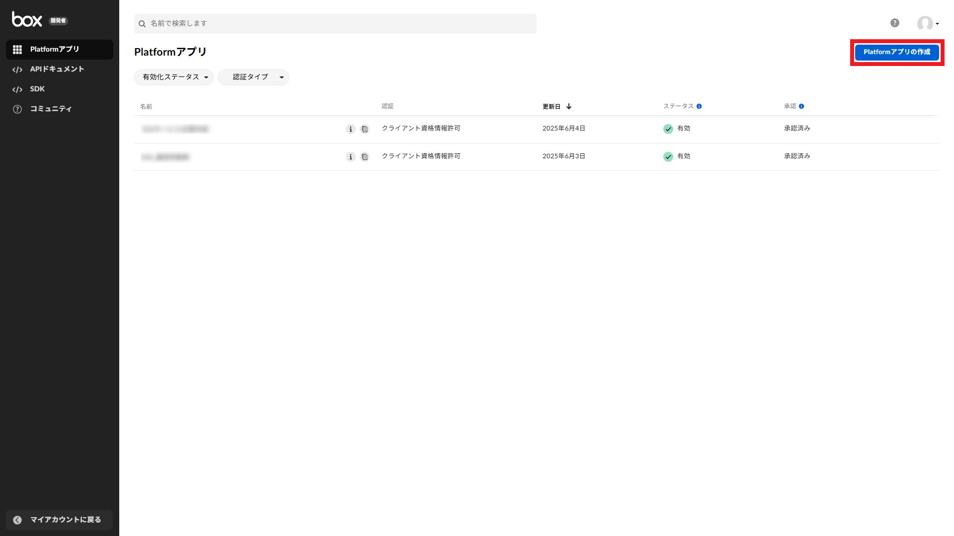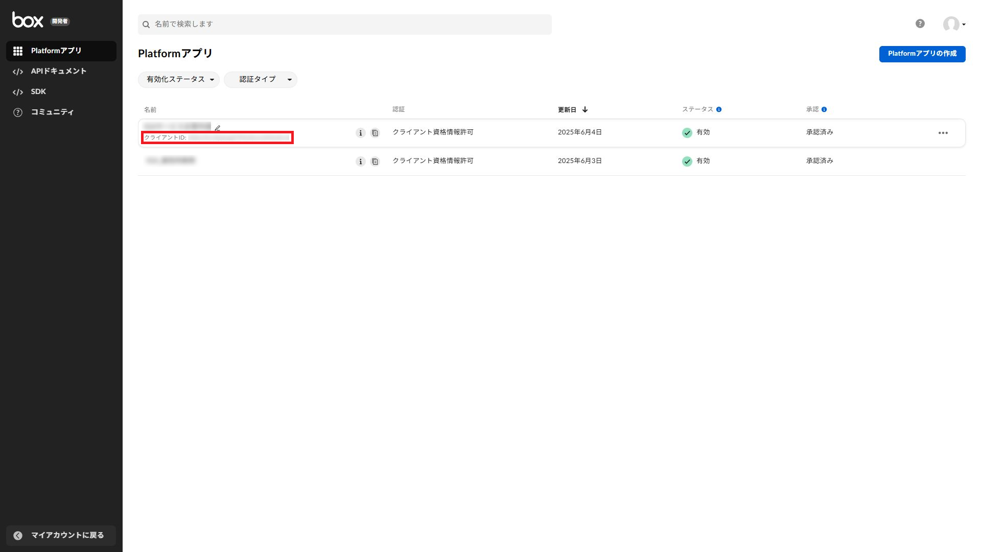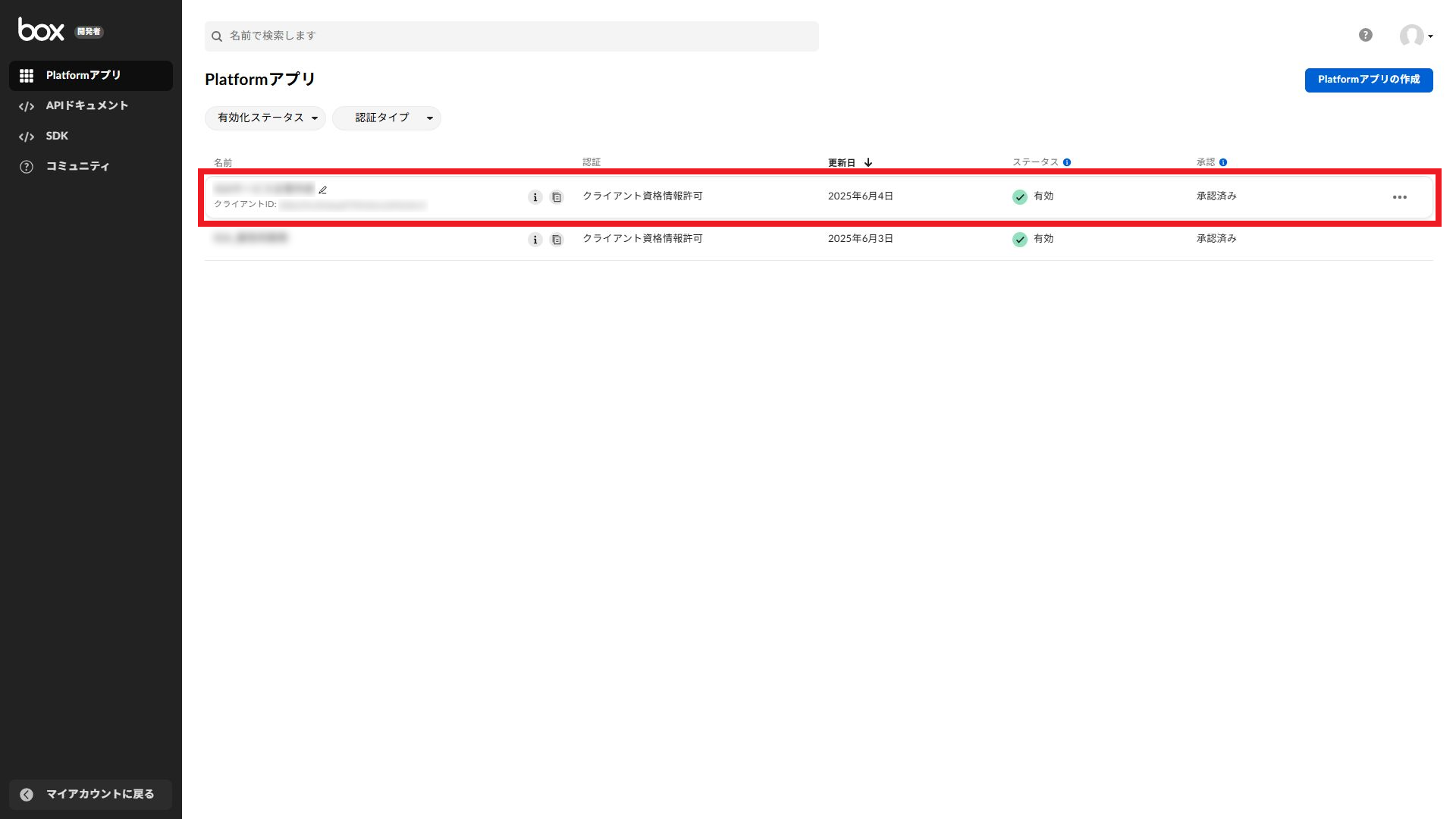 11.承認後、開発者コンソールのPlatformアプリから作成したアプリケーションをクリックします。