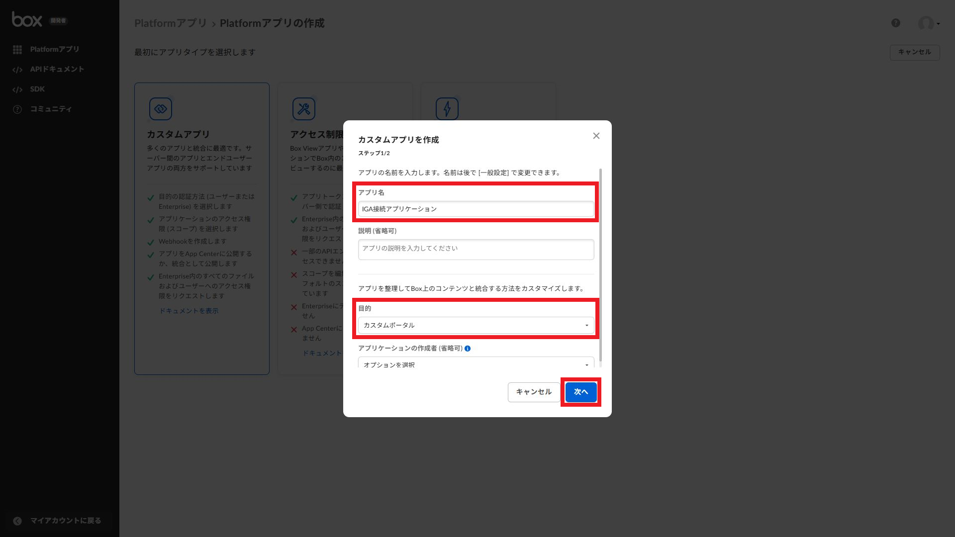 「カスタムアプリを作成 ステップ1/2」画面が表示されます。