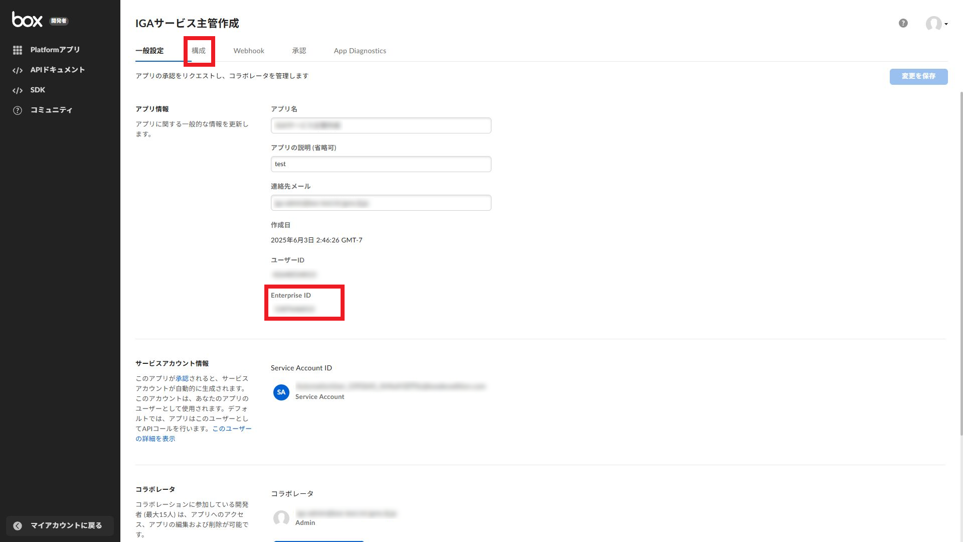 12.「一般設定」タブ画面に表示される「Enterprise ID」の値を控えたら「構成」タブをクリックします。