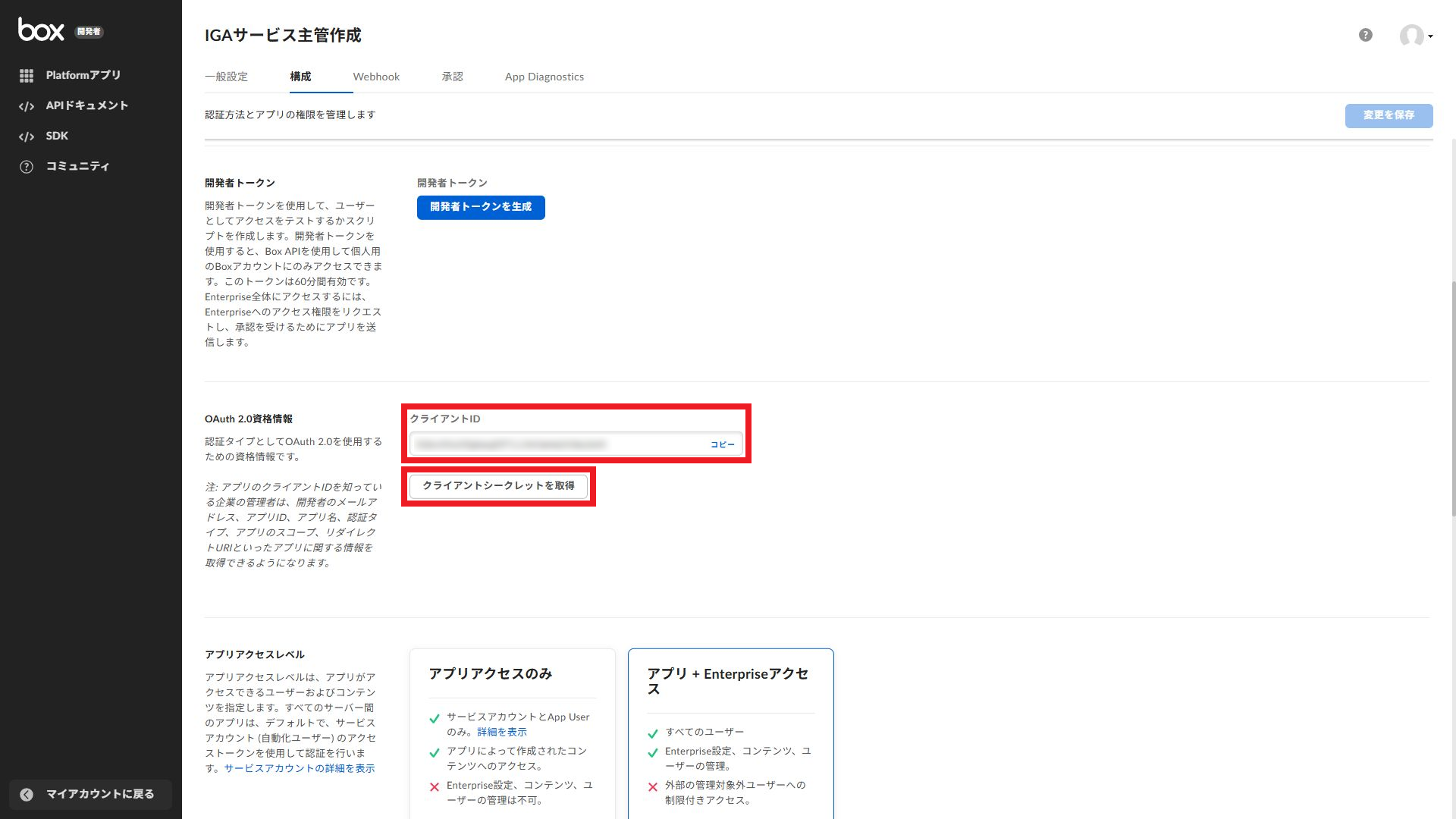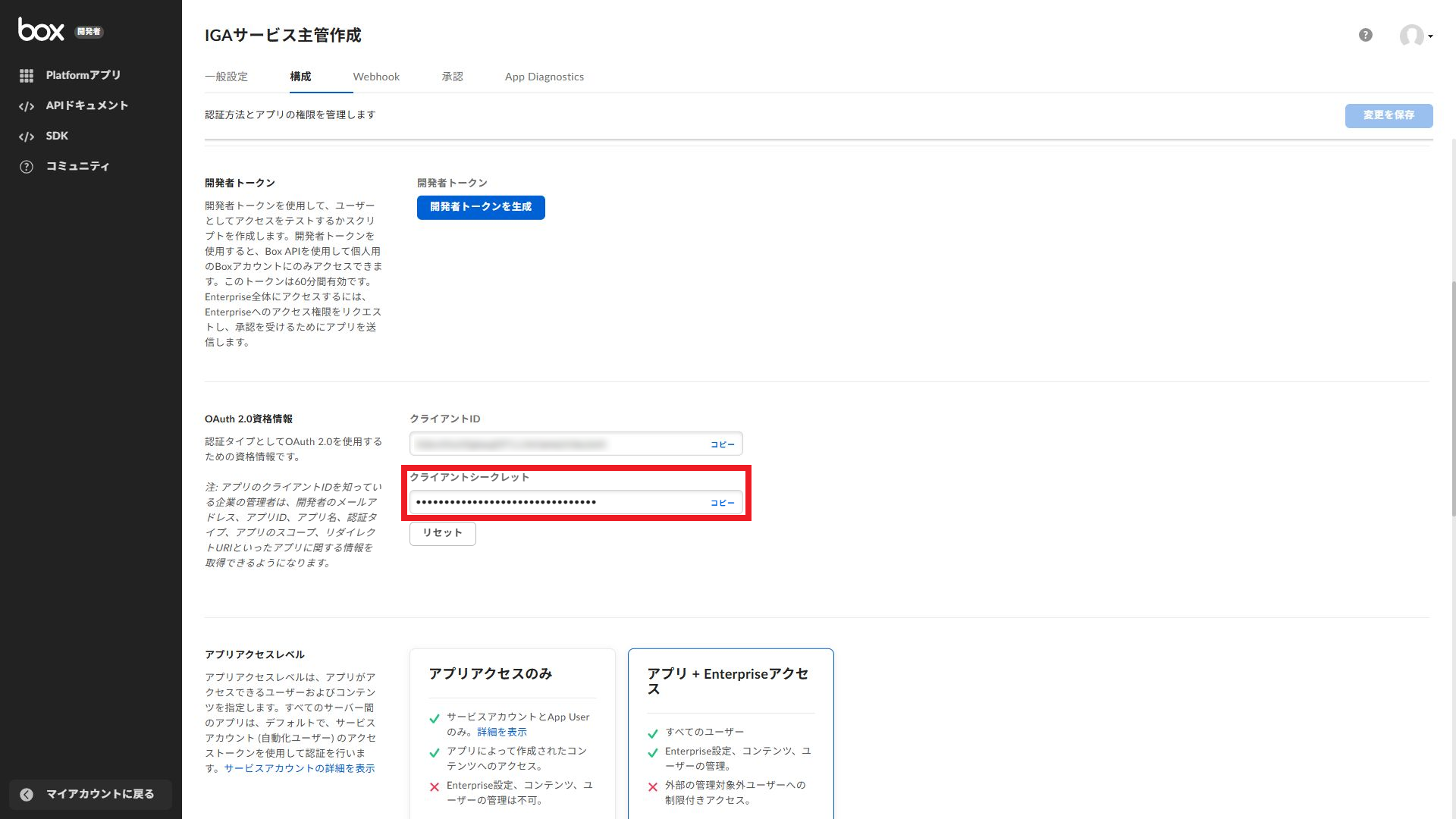 その場合、認証完了後に再度「クライアントシークレットを取得」をクリックするとクライアントシークレットの値が表示され、内容を控えることができます。