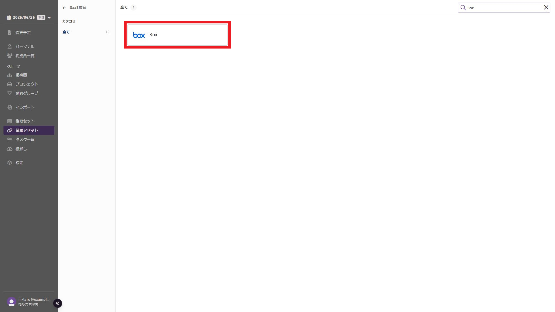 以下の画像には選択するSaaSのみが表示されていますが、実際は選択可能なSaaSが複数表示されます。以下の画像と同じ状況にするには、右上にある検索欄に「Box」と入力してください。