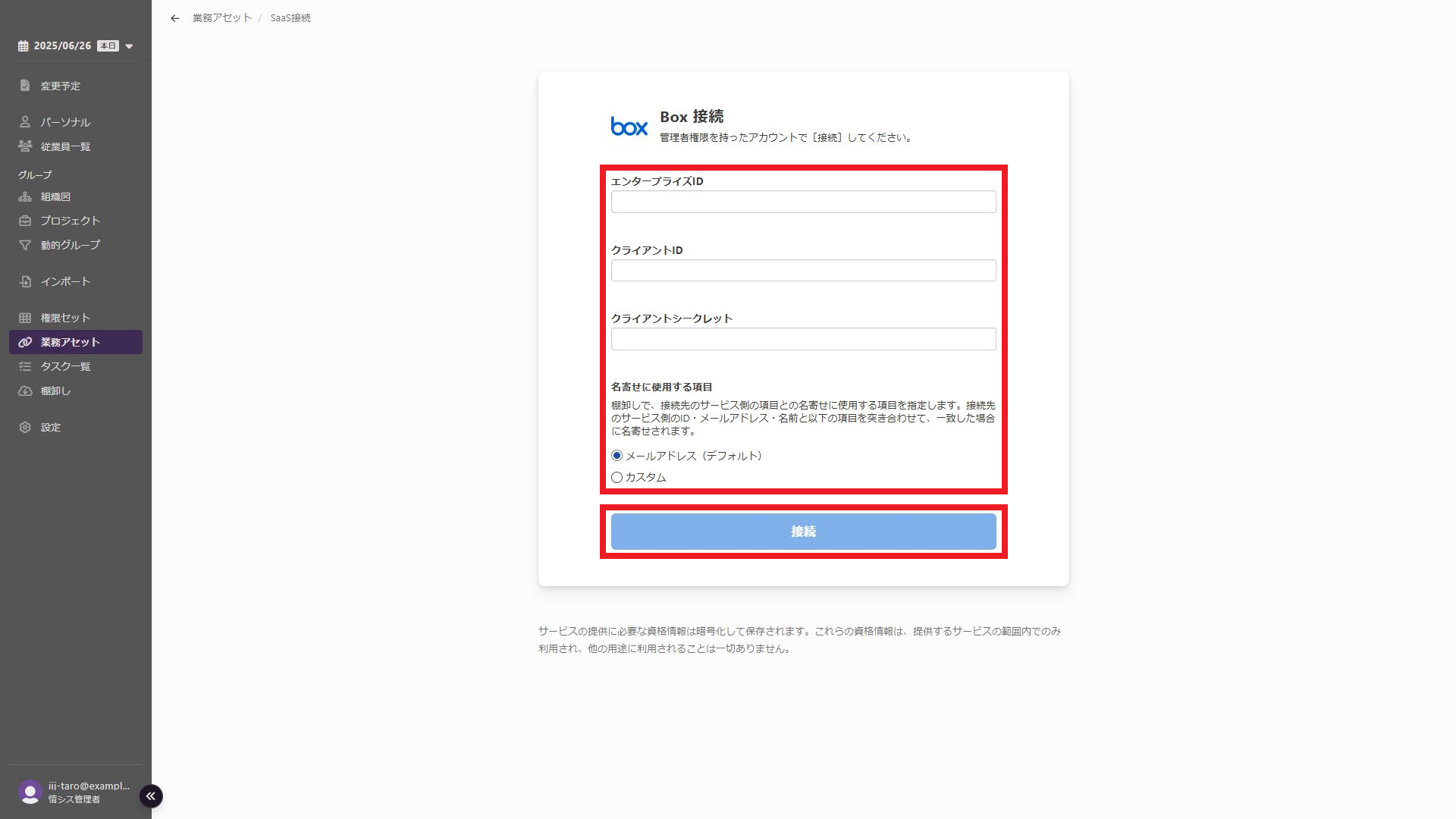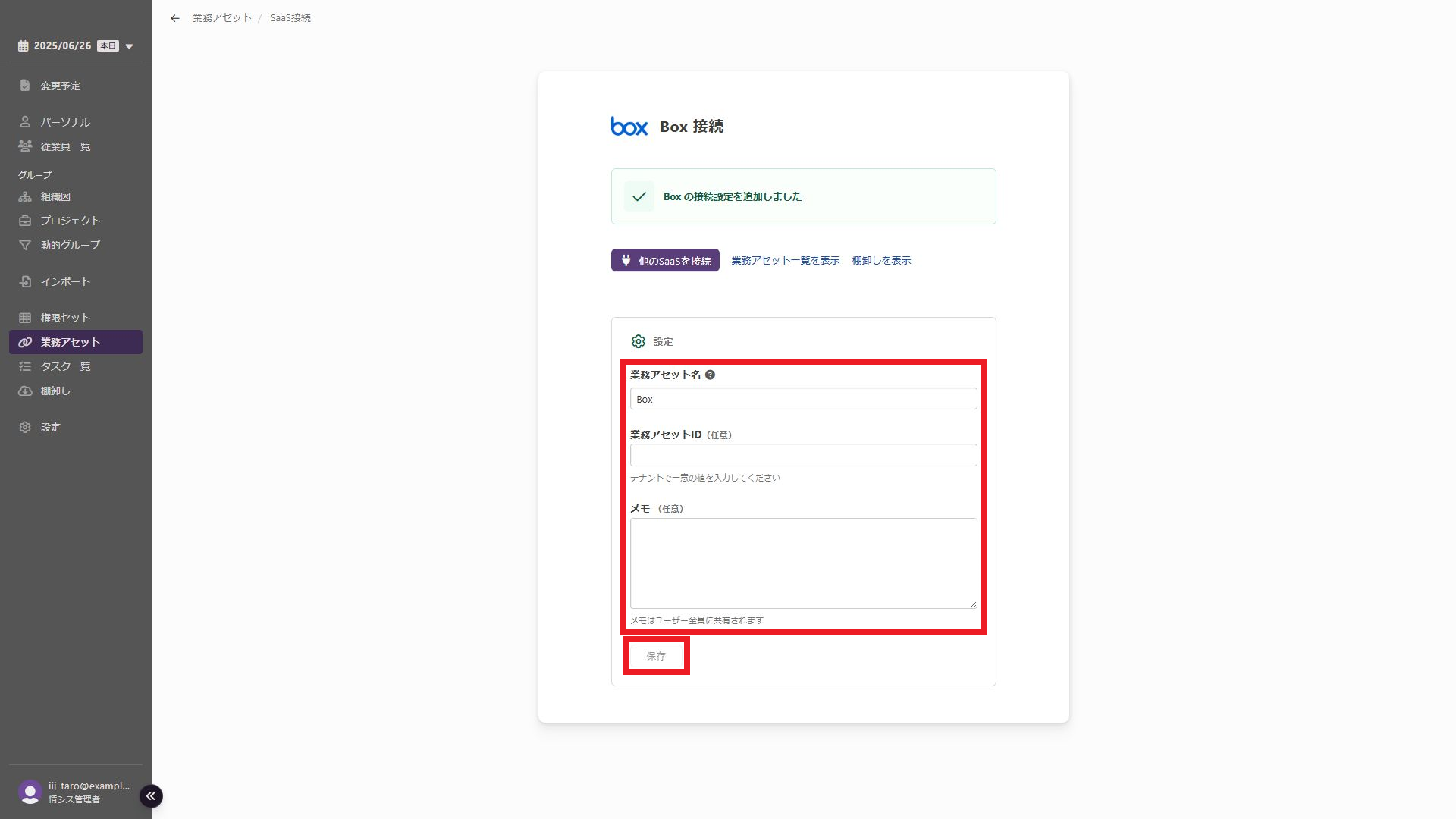 接続結果画面で業務アセットに関する以下の設定を行えます。設定項目を入力後、「保存」をクリックします。