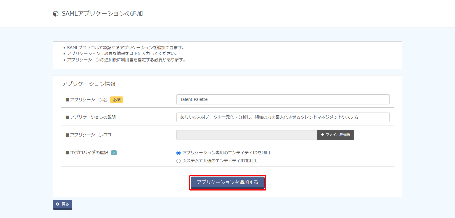 | IDプロバイダの選択 | 「アプリケーション専用のエンティティIDを利用」を選択 | 必須 | |