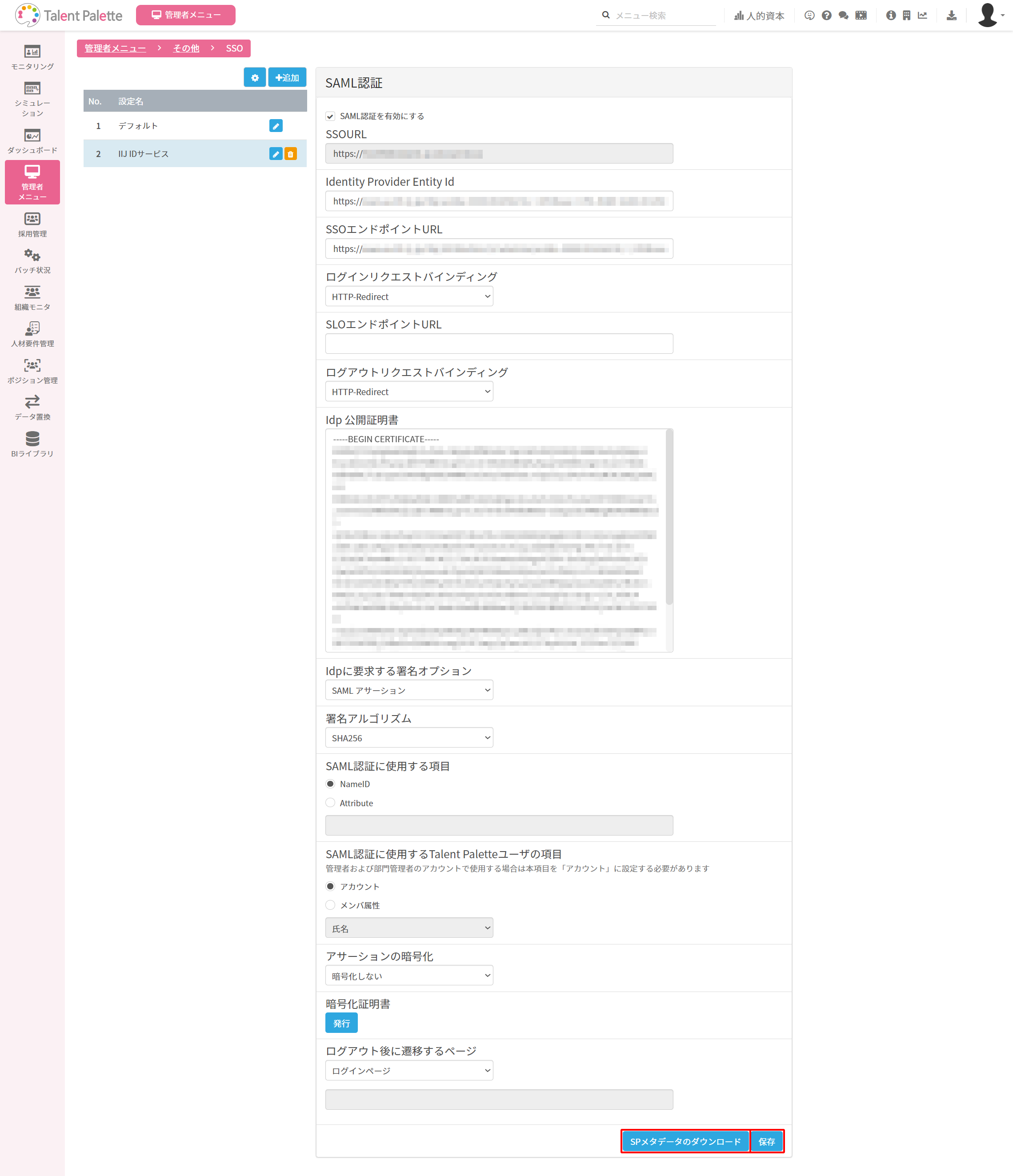 7. 以下のとおり設定し、「SPメタデータのダウンロード」をクリックします。「保存」をクリックします。