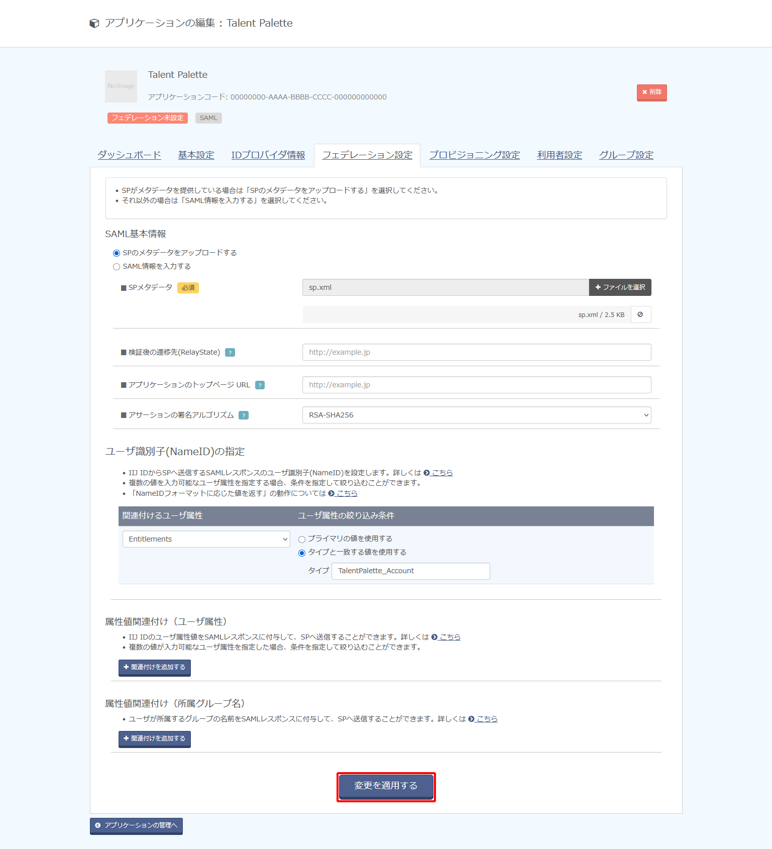 | SAML基本情報 | SPのメタデータをアップロードする | 「SPのメタデータをアップロードする」をチェック | |||||||