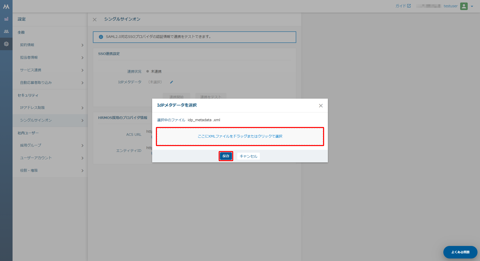 4. 手順2-3でダウンロードしたIDプロバイダのメタデータを選択し、「保存」をクリックします。