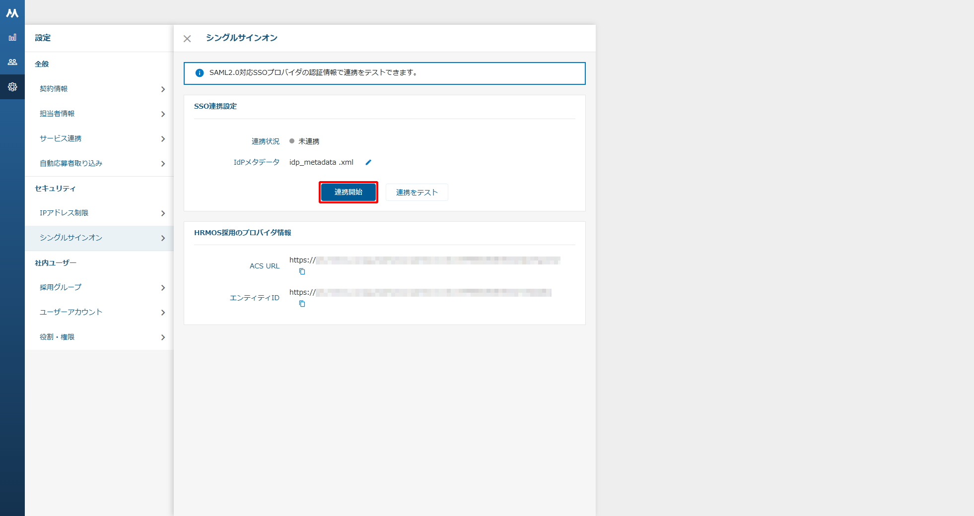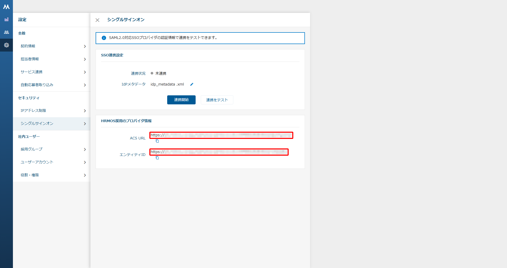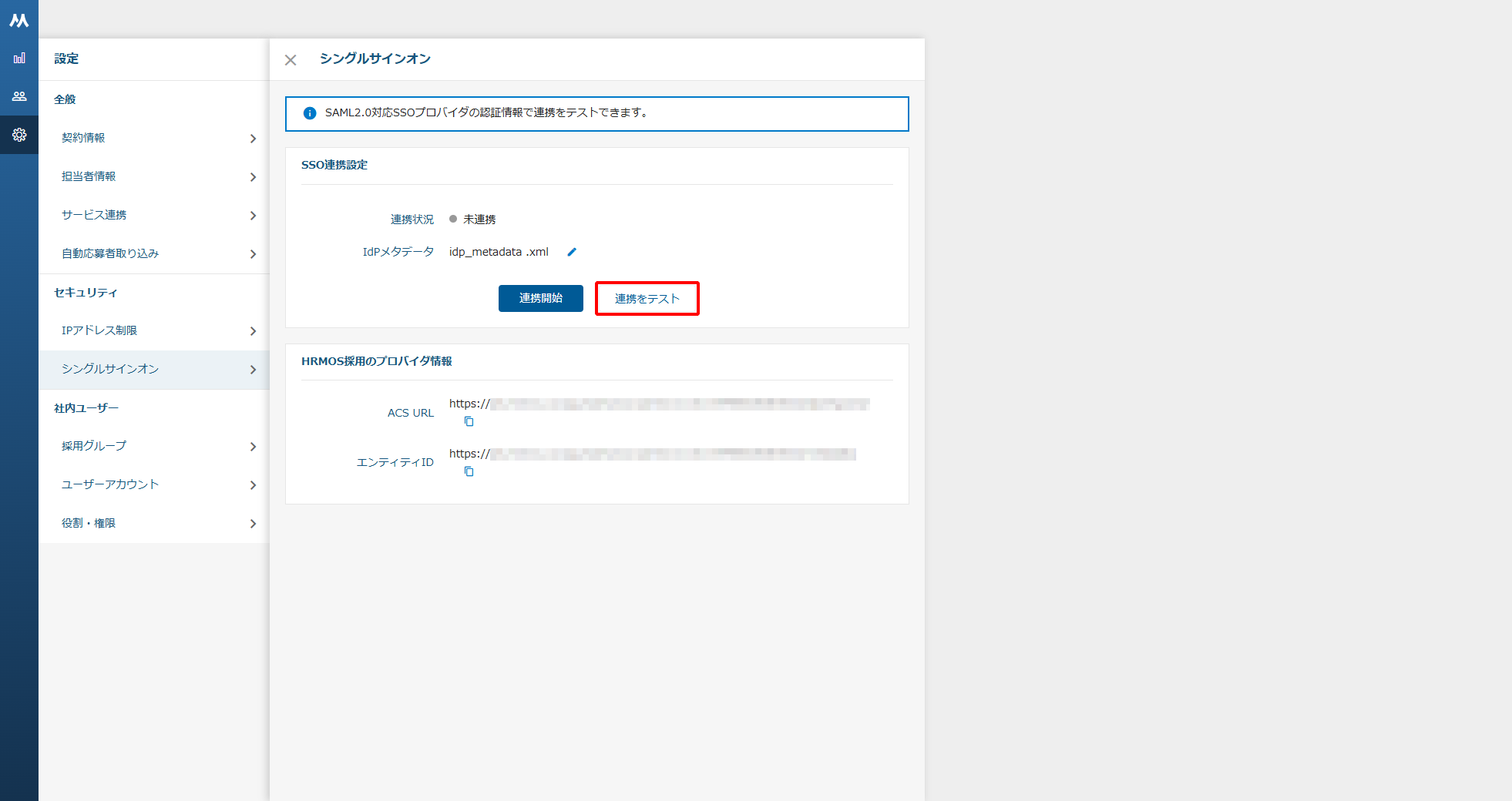 - HRMOS採用のアカウントに紐づかないIIJ IDサービスのアカウントでログインした場合、またはログイン済みの場合、接続テストに失敗します。