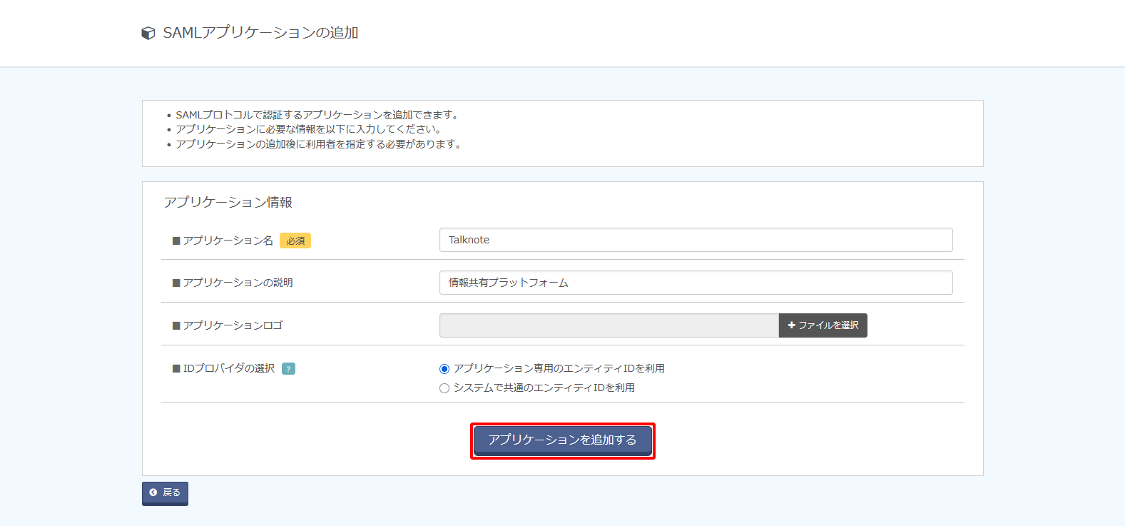 | IDプロバイダの選択 | 「アプリケーション専用のエンティティIDを利用」を選択 | 必須 |