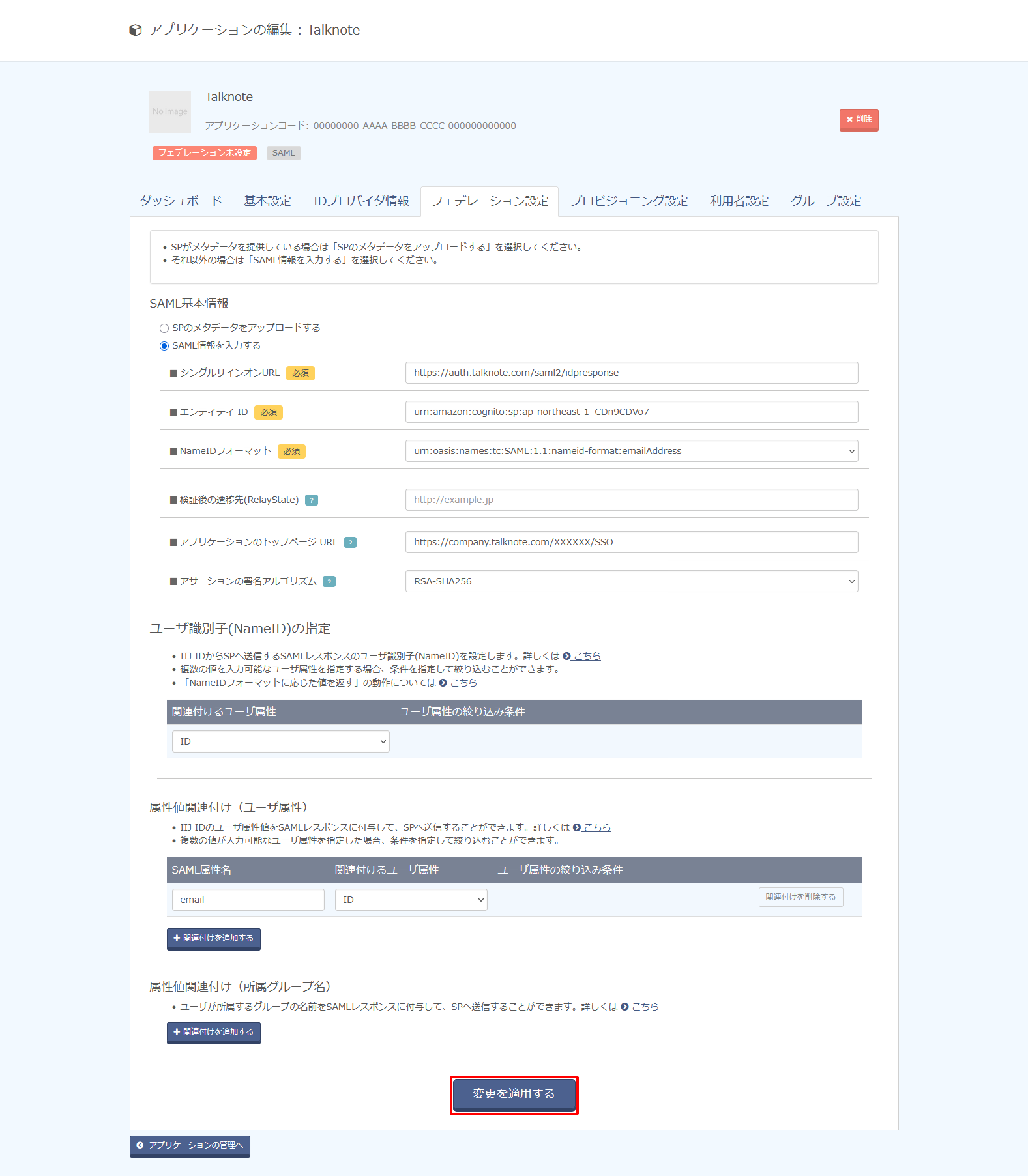 | アプリケーションのトップページURL | https://company.talknote.com/XXXXXX/SSO | 「XXXXXX」の部分は、Talknoteのネットワークコード名の値を入力します。ネットワークコード名が不明な場合には、Talknoteにお問合わせください |