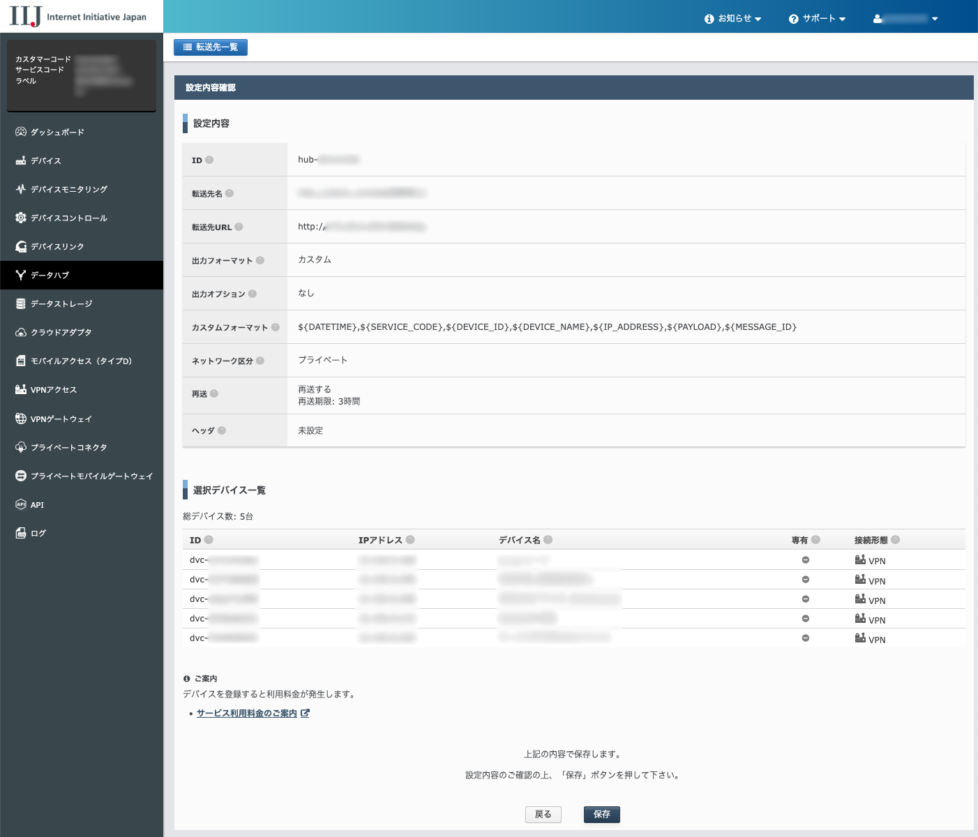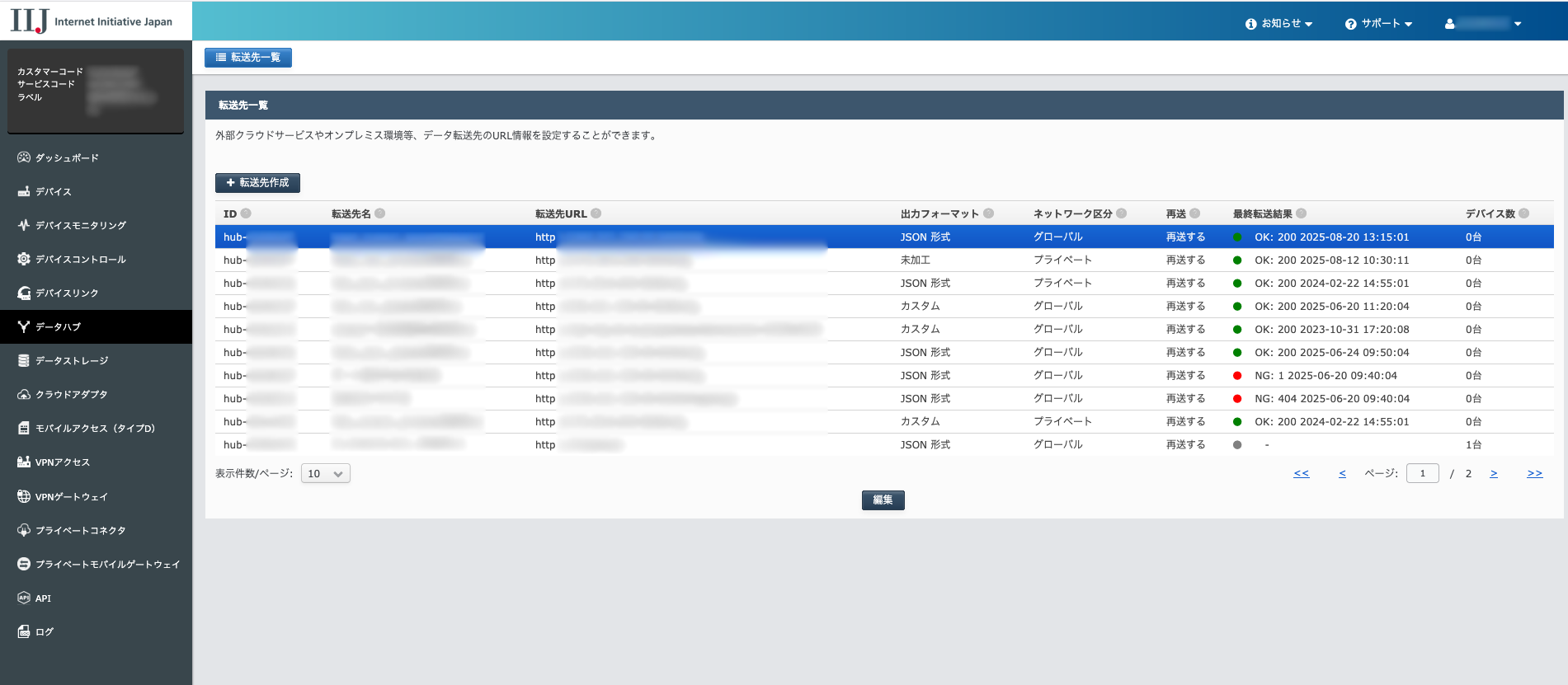 データ転送先設定の一覧を表示します。IoTサービスプラットフォームに送信したデータを、ここで設定した転送先へ転送できます。