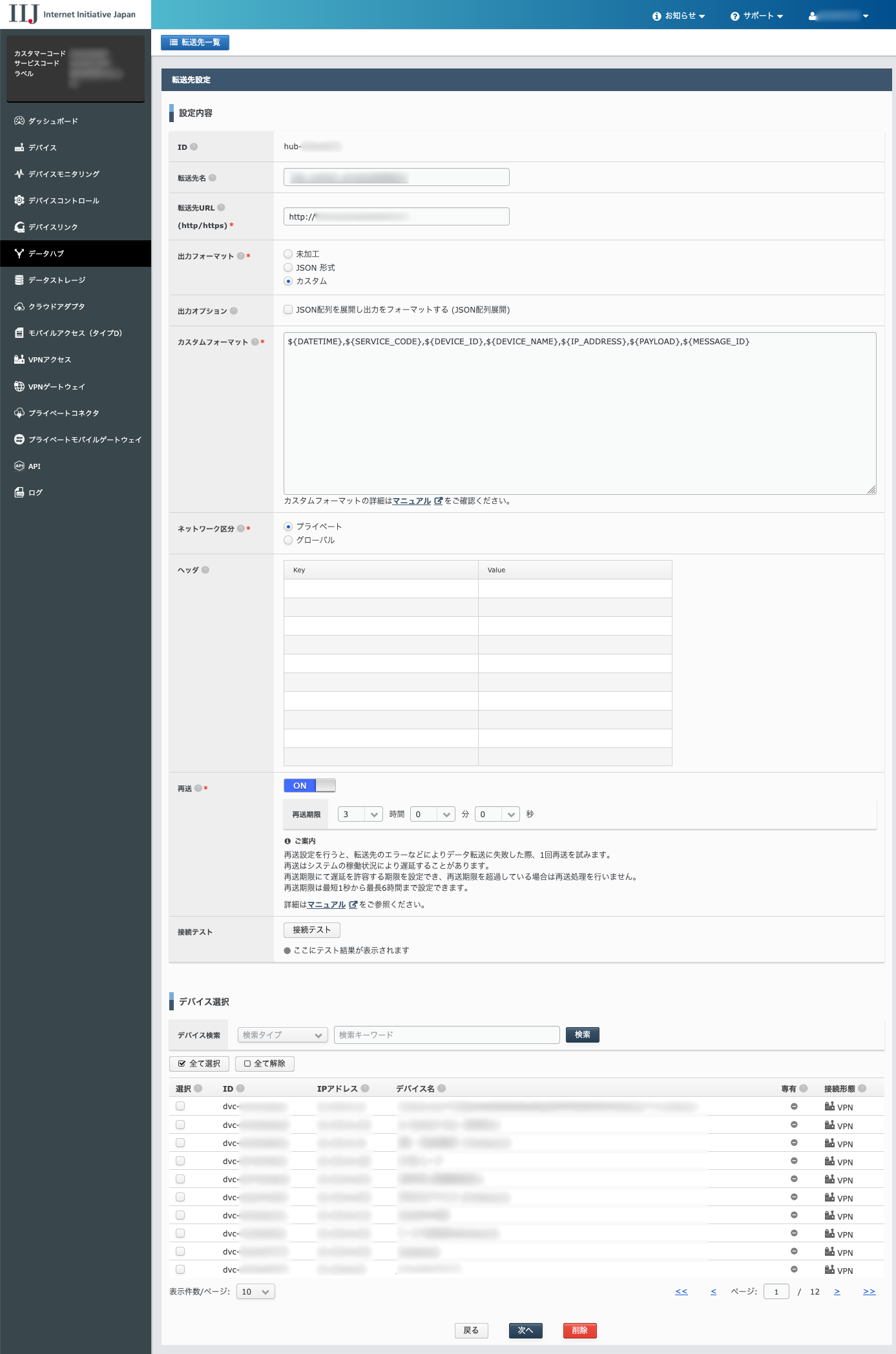 | 再送 | 転送先のエラーなどによりデータ転送に失敗した際、再送の実施有無と再送までの期限を設定することができます。 再送の詳細は、データハブの再送処理をご覧ください。 |