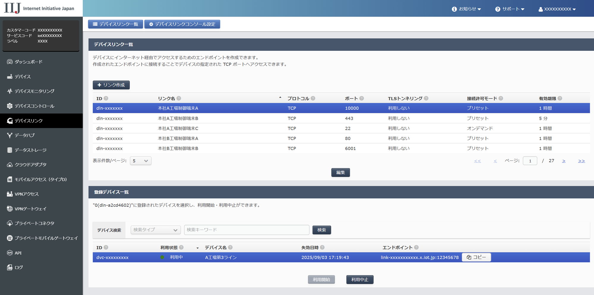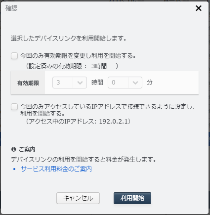 | 「利用開始」ボタン | 指定されたデバイスでデバイスリンクの利用を開始します。 |