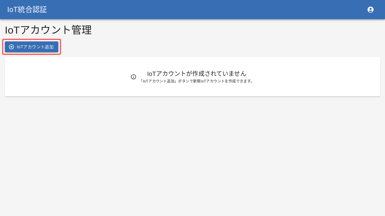 IoTアカウント管理 一覧画面 にアクセスし、「IoTアカウント追加」ボタンを押下してください。