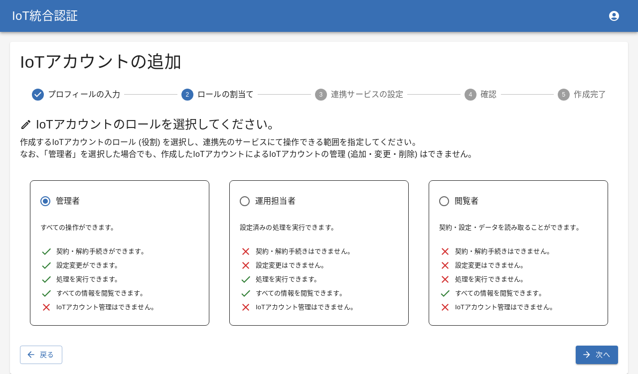 作成するアカウントに割り当てるロールを選択し、「次へ」ボタンを押下してください。