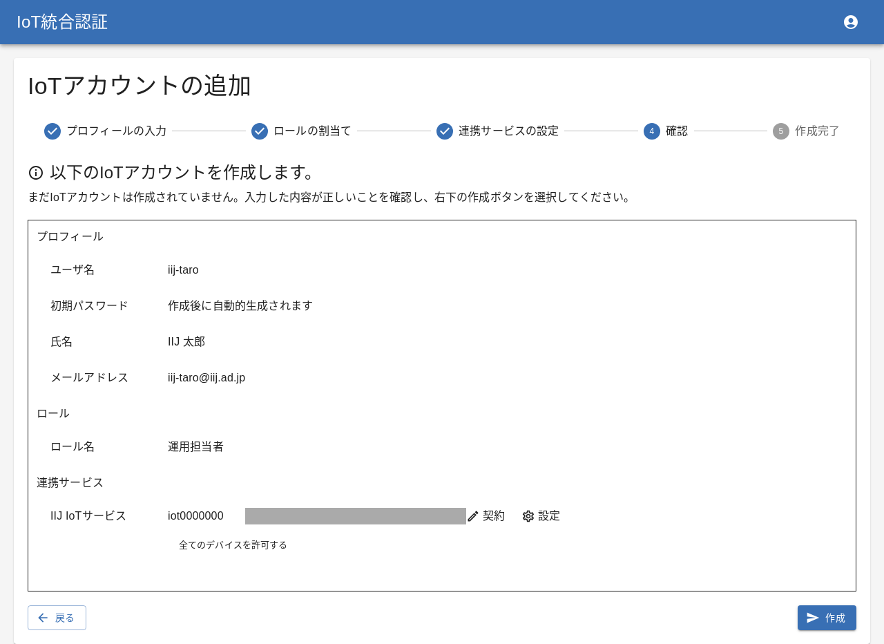 内容を確認後、修正したい場合「戻る」ボタンを押下してください。問題がなければ「作成」ボタンを押下してください。