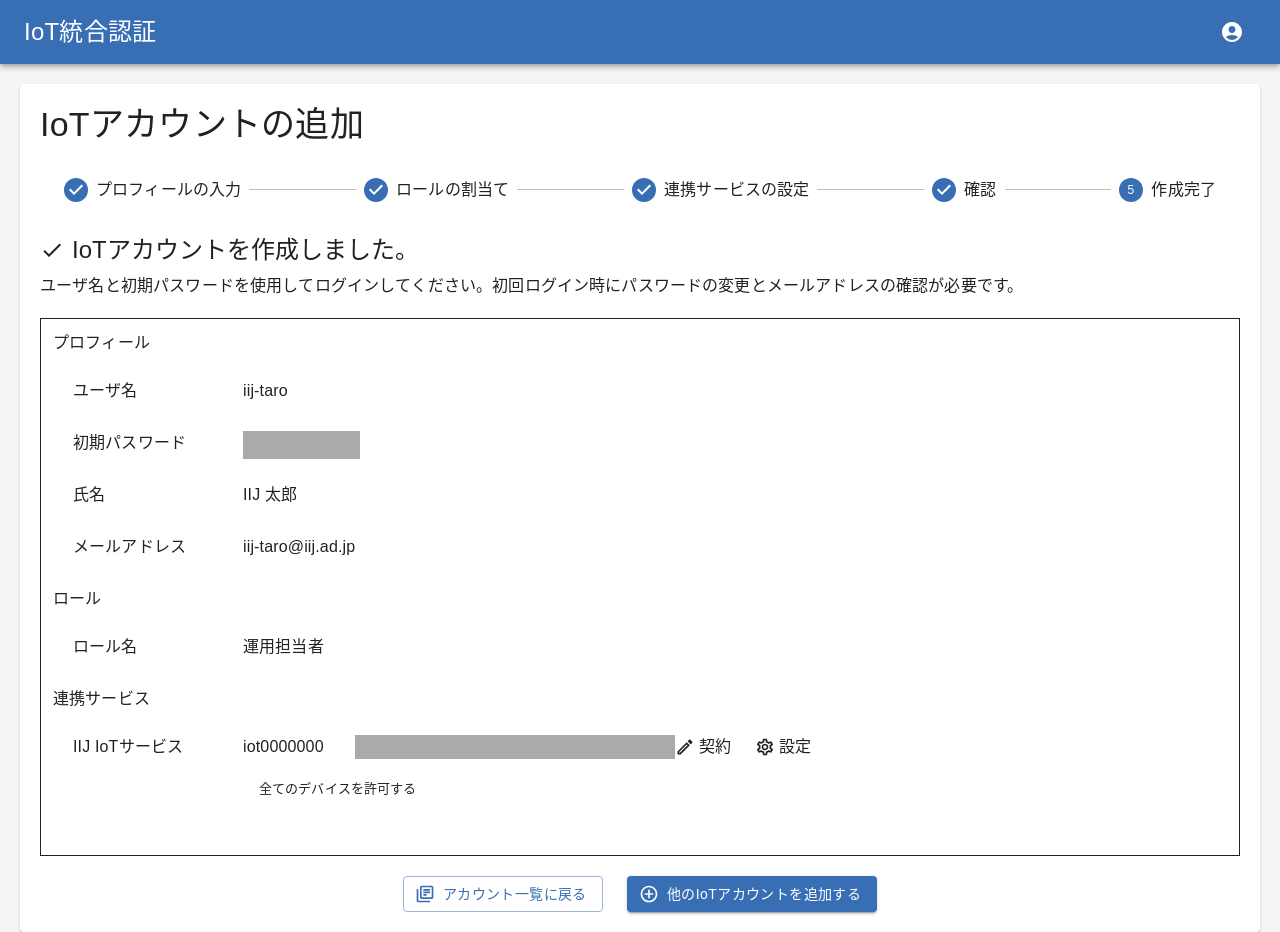作成したIoTアカウントのユーザ名と初期パスワードを利用者にお伝えください。