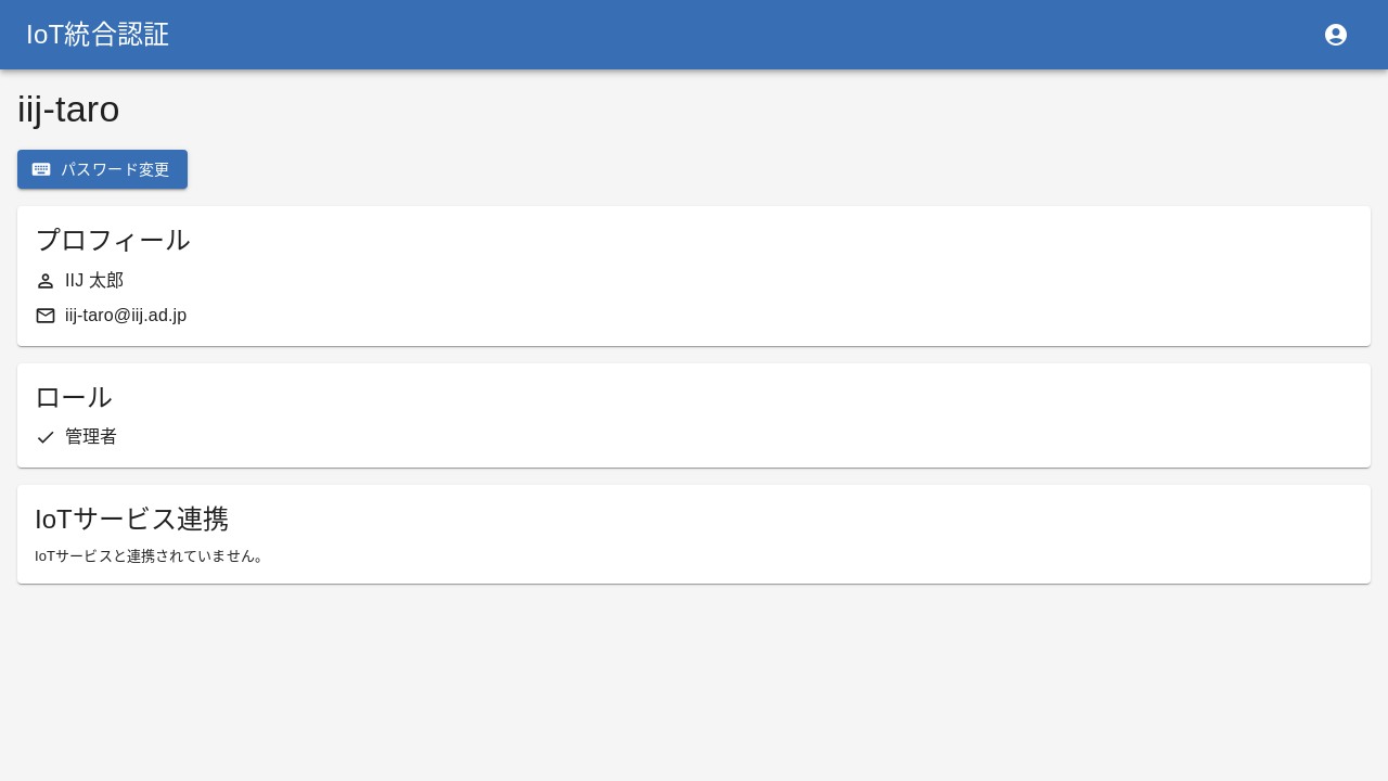 IoT統合認証ホーム画面では、IoTアカウントのプロフィール・割り当てられているロール・IIJ IoTサービス連携状況を確認できます。また、パスワードの変更ができます。