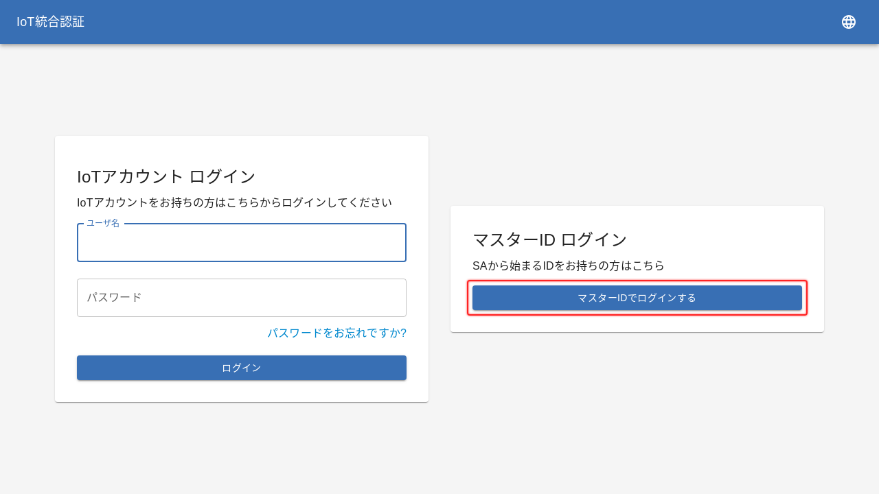 https://auth-console.iot.iij.jp をブラウザで開き、「マスターIDでログインする」を押下してください。