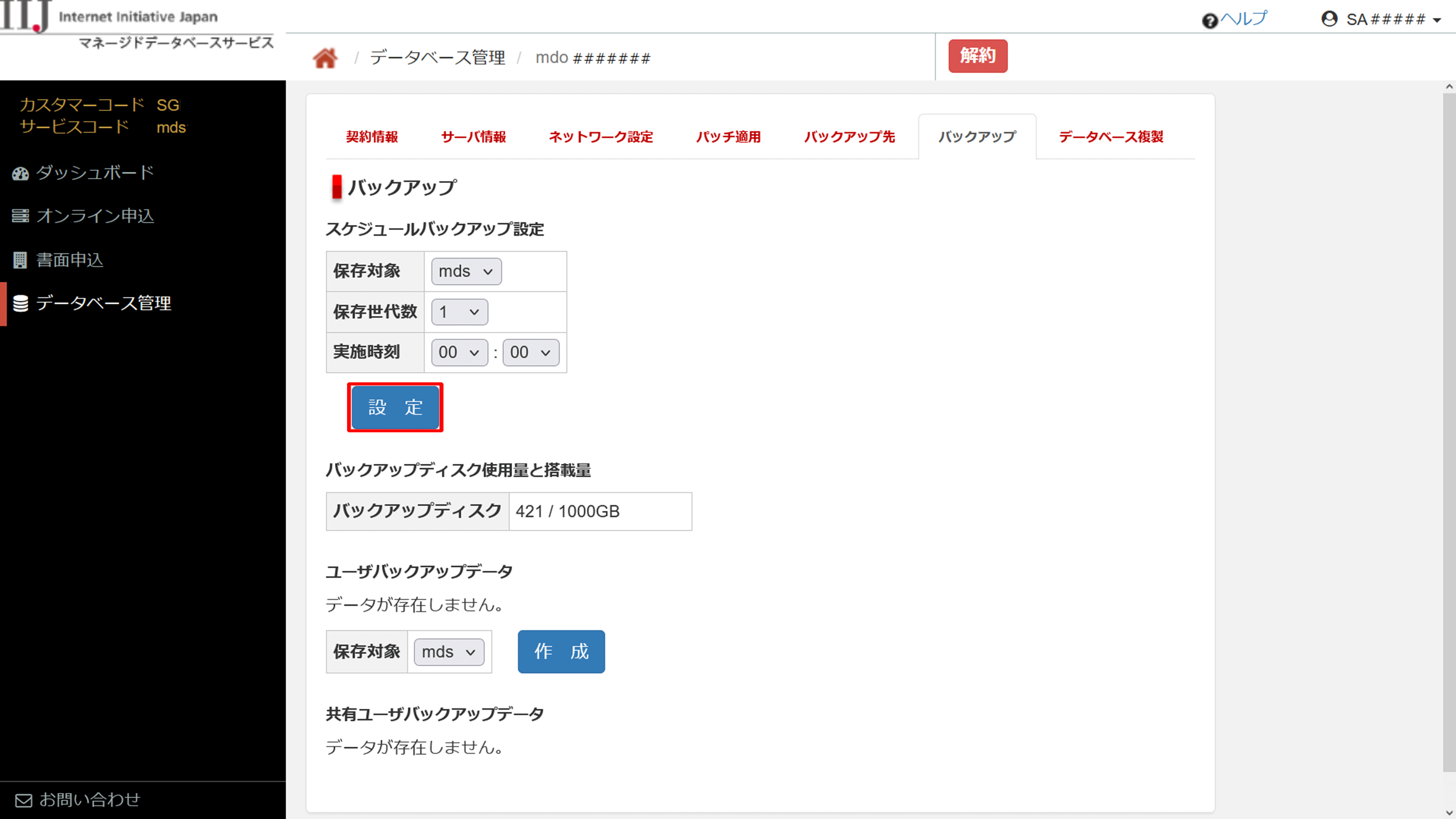「データベース管理」画面の表示方法については、「契約情報を確認する」をご覧ください。