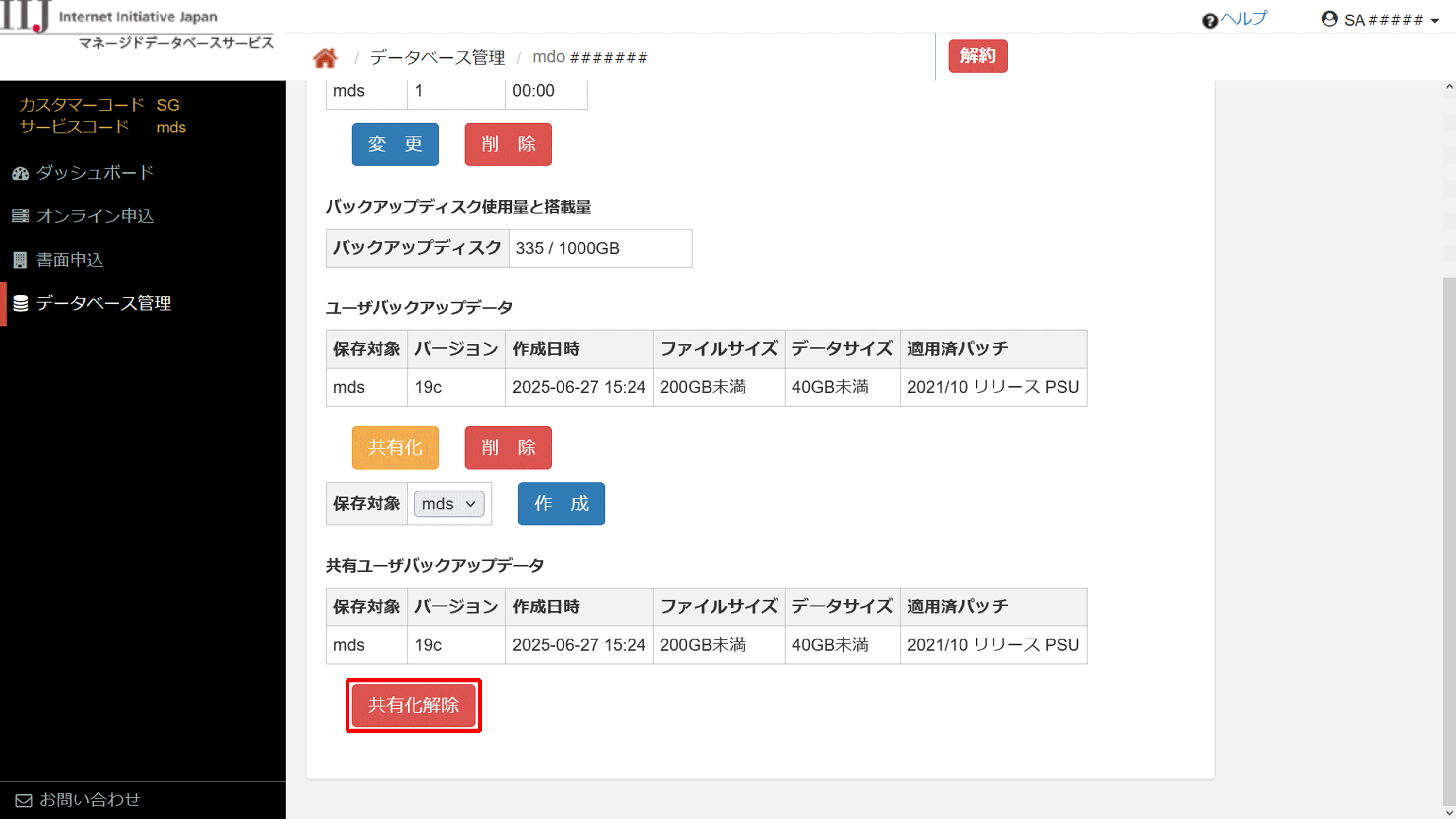 「データベース管理」画面の表示方法については、「契約情報を確認する」をご覧ください。