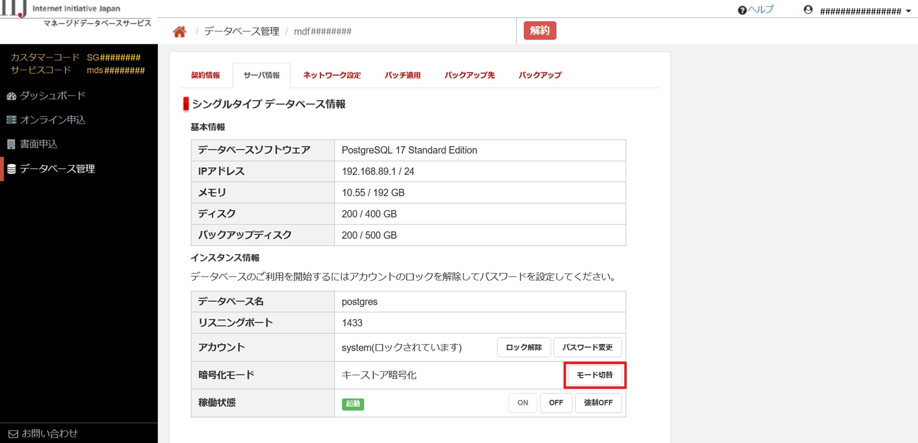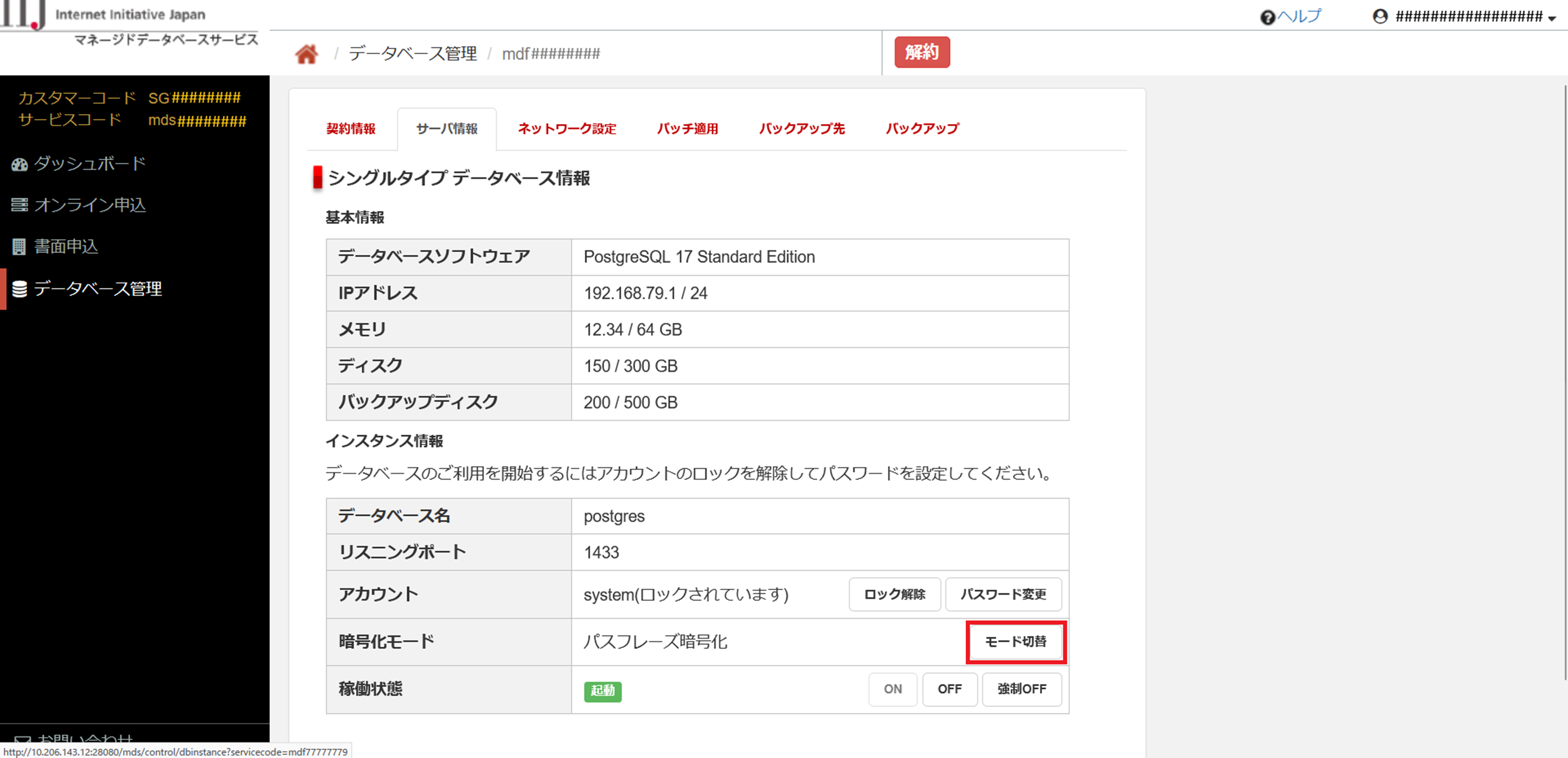 「データベース管理」画面の「サーバ情報」タブでは、データベースインスタンスの暗号化モードを切り替えることができます。