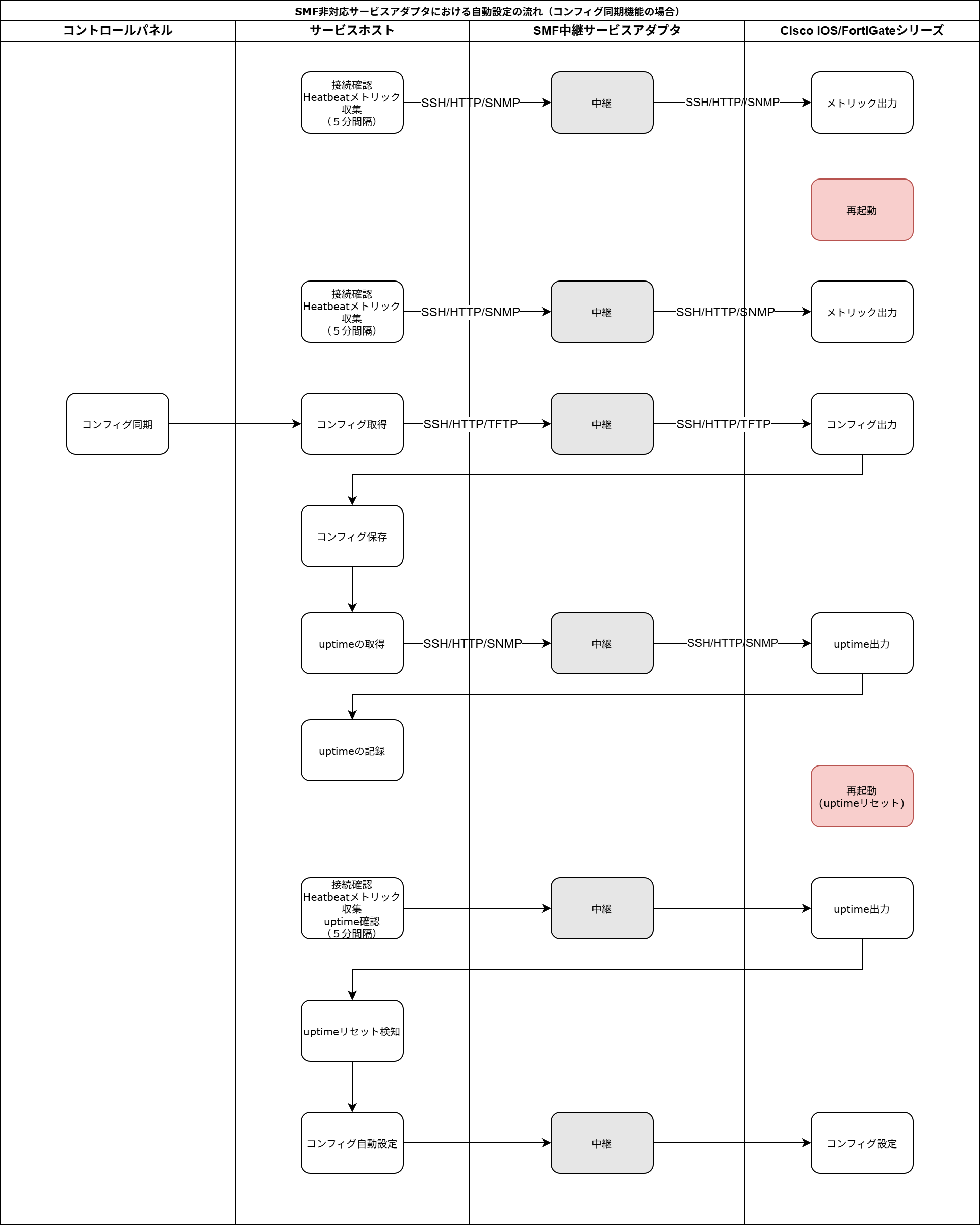 - SMF中継サービスアダプタとの接続性が失われる設定を投入すると、自動的に復帰できません。接続性が失われた場合は、コンソールなどで再度キッティングコンフィグを投入してください。