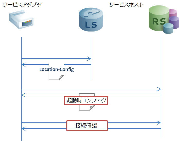 続いてRSにアクセスして「起動時コンフィグ」を取得し、システムに反映させます。サービスアダプタはこの設定内容に基づいて動作しますが、サービスアダプタとサービスホストの相互通信が可能であるか「接続確認」を行います。