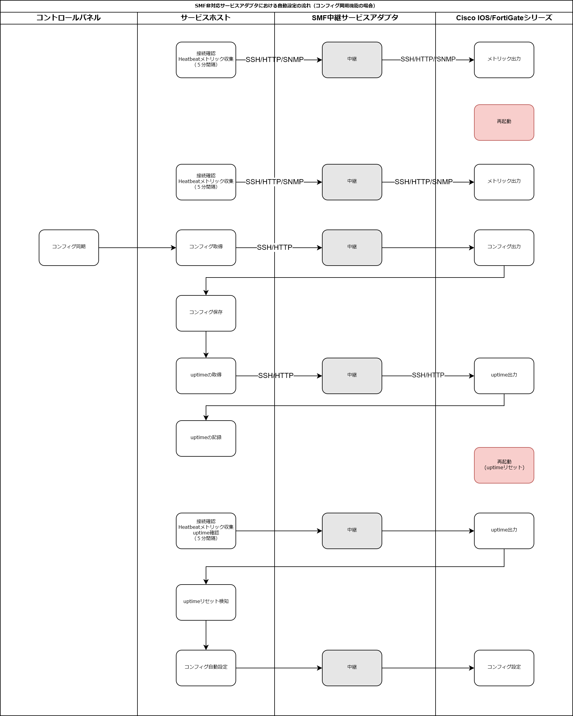 - FortiGateシリーズにおいては、SMF中継サービスアダプタとの接続性が失われる設定を投入すると、自動的に復帰することができません。接続性が失われた場合は、コンソール等から再度キッティングコンフィグの投入が必要です。