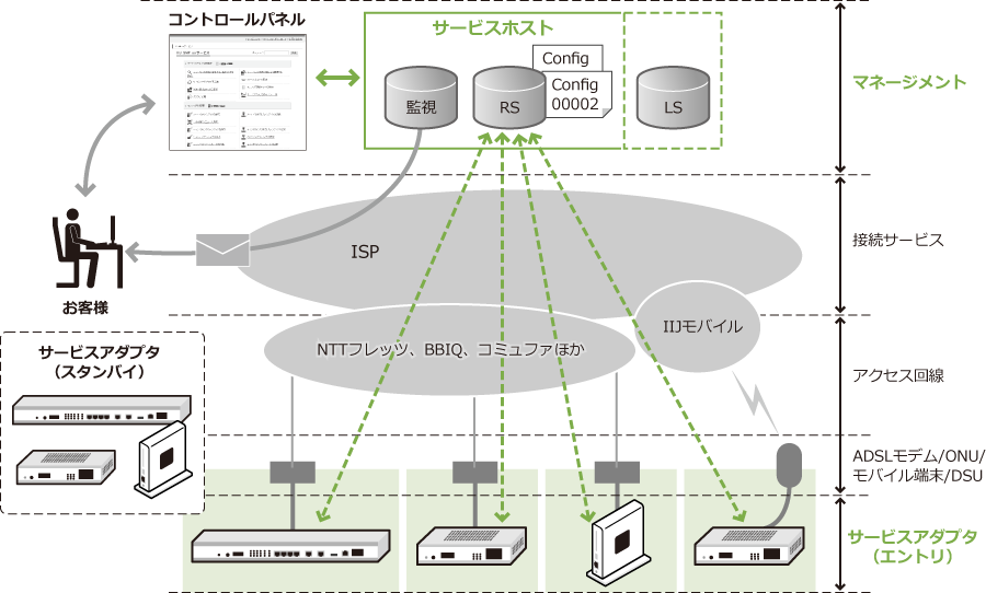 | マネージメント | サービスアダプタを管理する機能です。「IIJサービスオンライン」上の「コントロールパネル」で利用します |