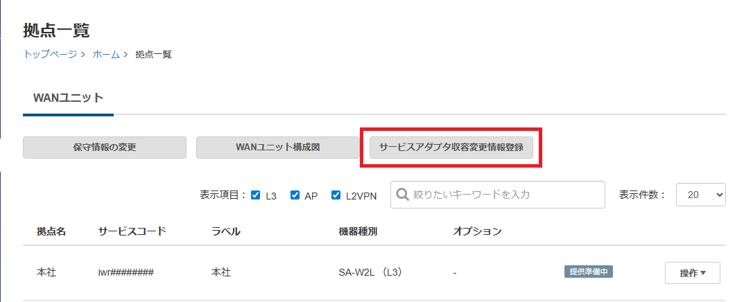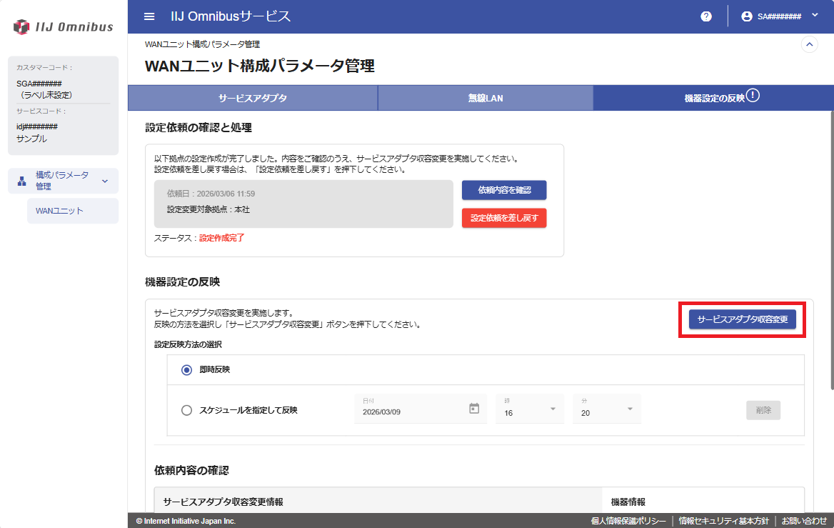 1.「サービスアダプタの設定を作成し反映する(WANユニット)」を参考に設定の依頼を行います。