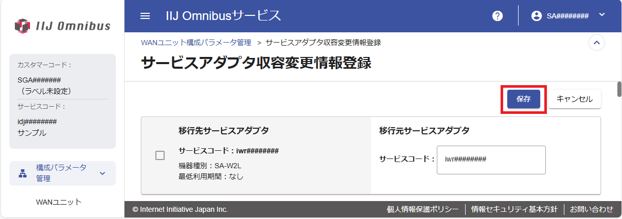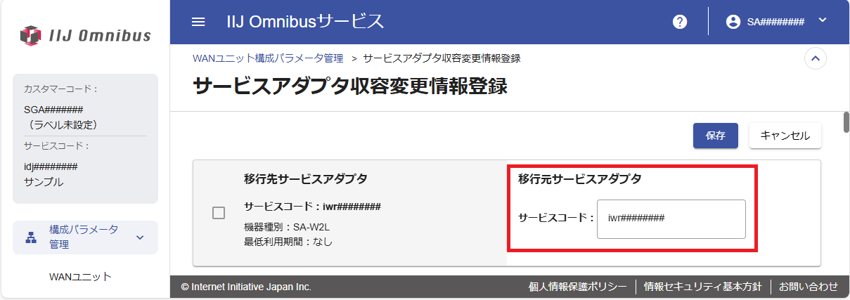 5.移行先として準備した新しいサービスコード(iwr########)の項目にある、サービスコードの入力欄に、移行させたい拠点のサービスコード(iwr########)を入力します。