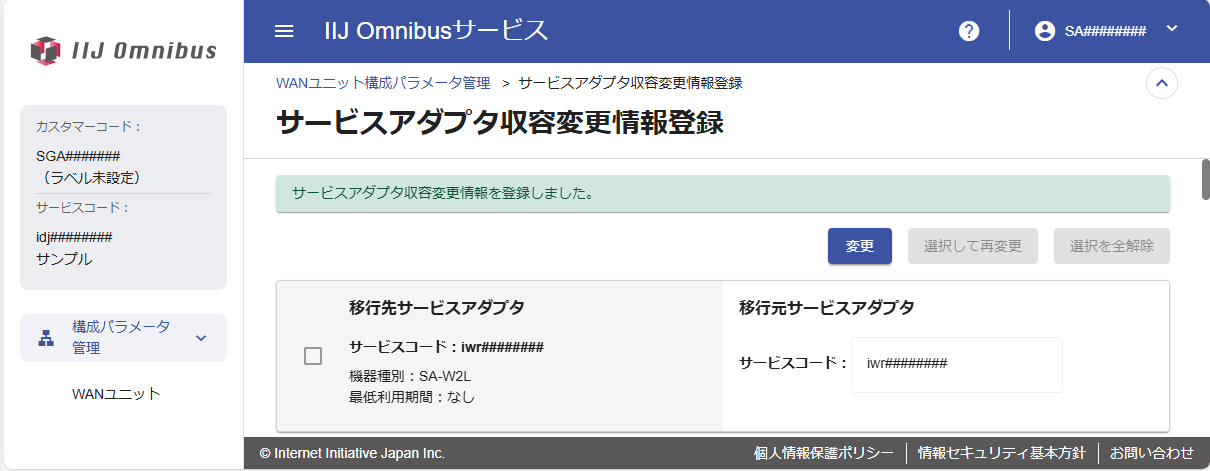 なお、サービスアダプタ収容変更完了を実施することで、移行元となったサービスコードに対して即時で解約処理が行われます。