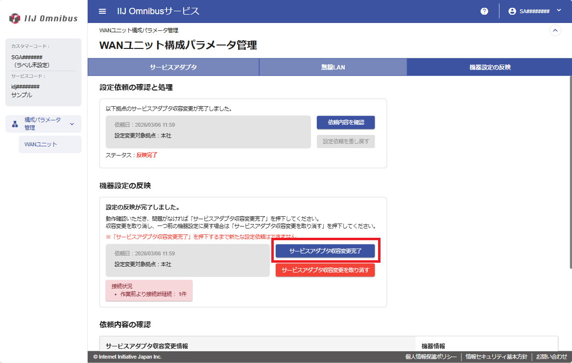 5. 反映完了後に内容を確定させる場合は「サービスアダプタ収容変更完了」をクリックします。