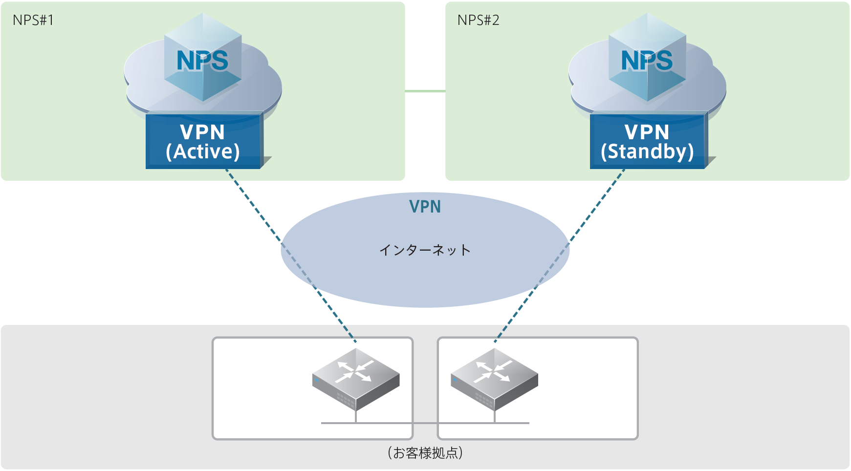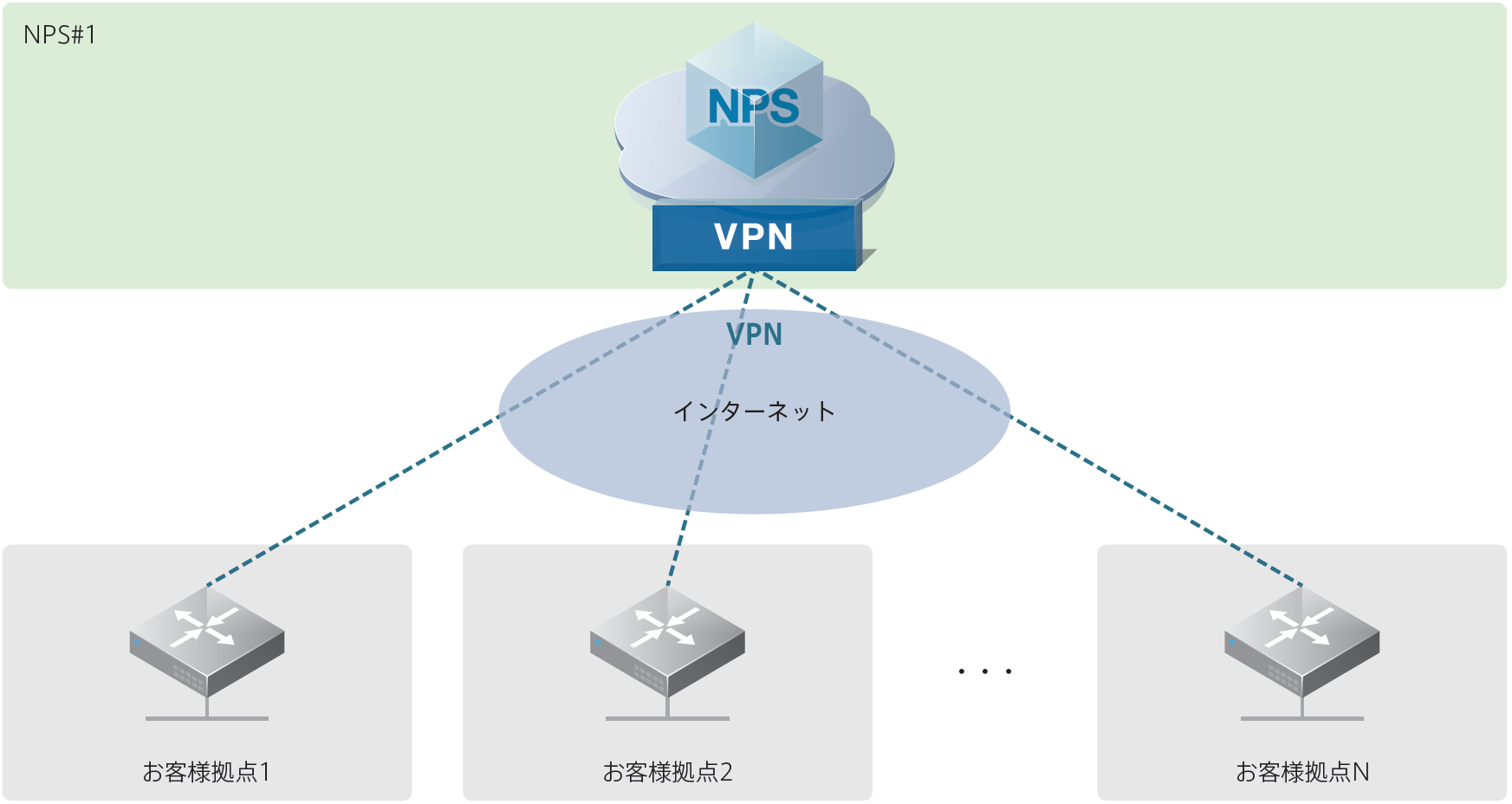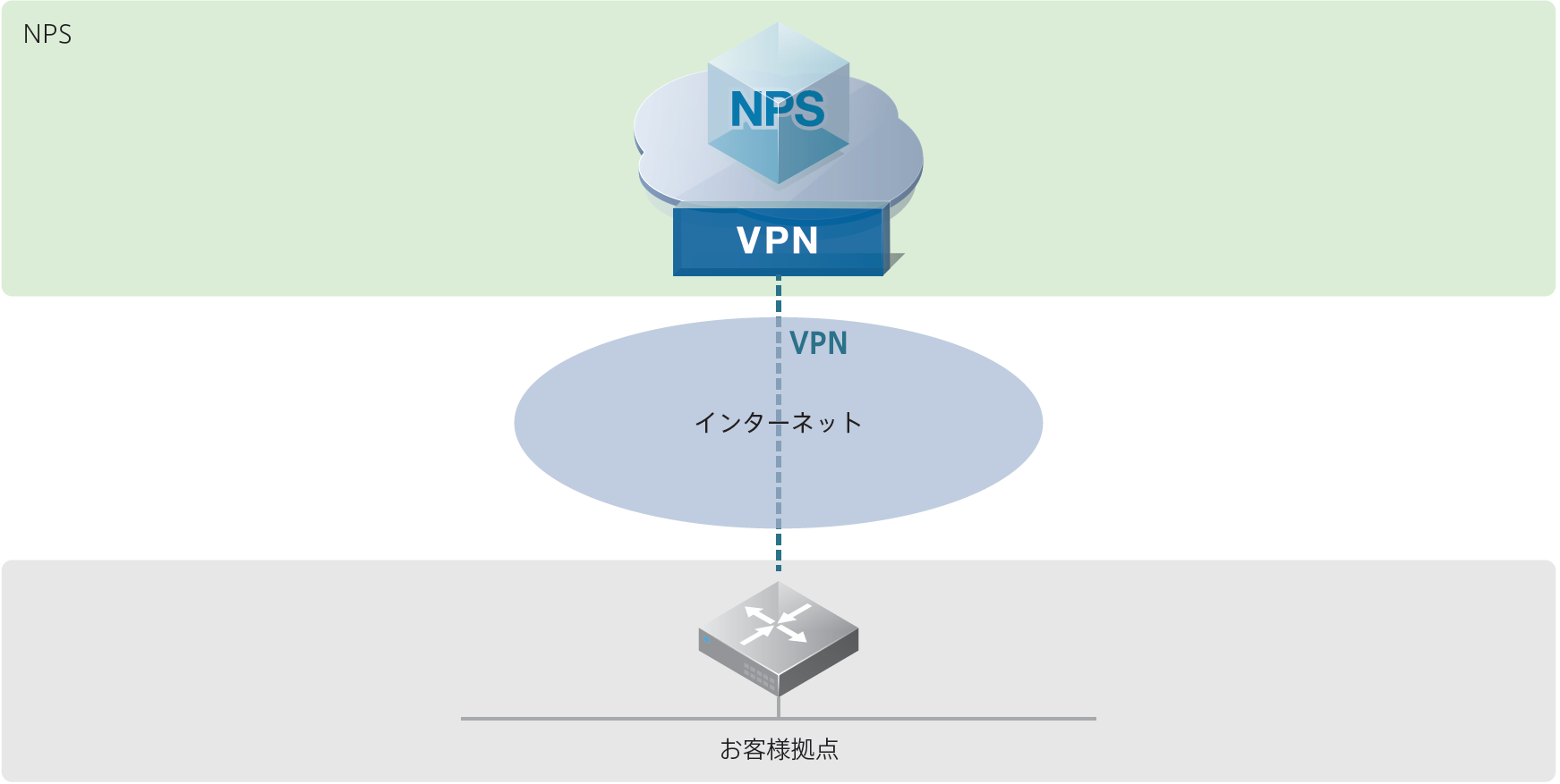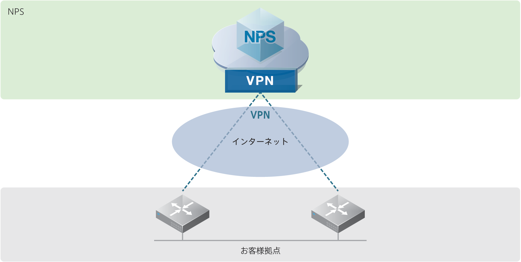 NPSにIPsecによるポイント・ツー・ポイント型のVPN構築機能を追加するには、VPNモジュールをご契約ください。お客様拠点のVPN機器を介してNPSに接続できます。