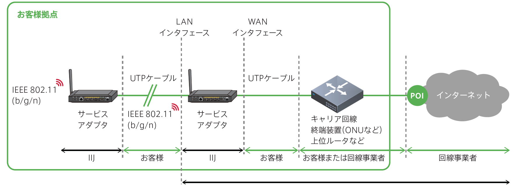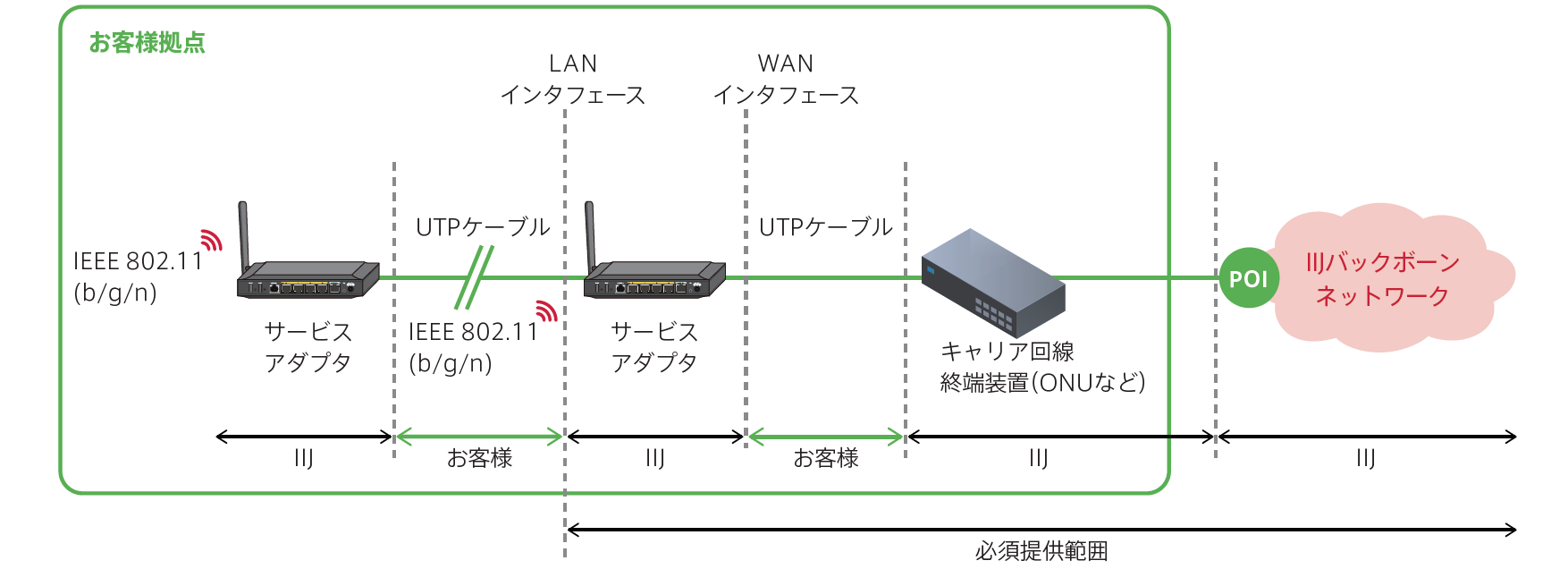 障害時の切り分けが適切に実施できない場合がありますので、お客様が用意した機器を、サービスアダプタとキャリア回線終端装置間に接続しないでください。