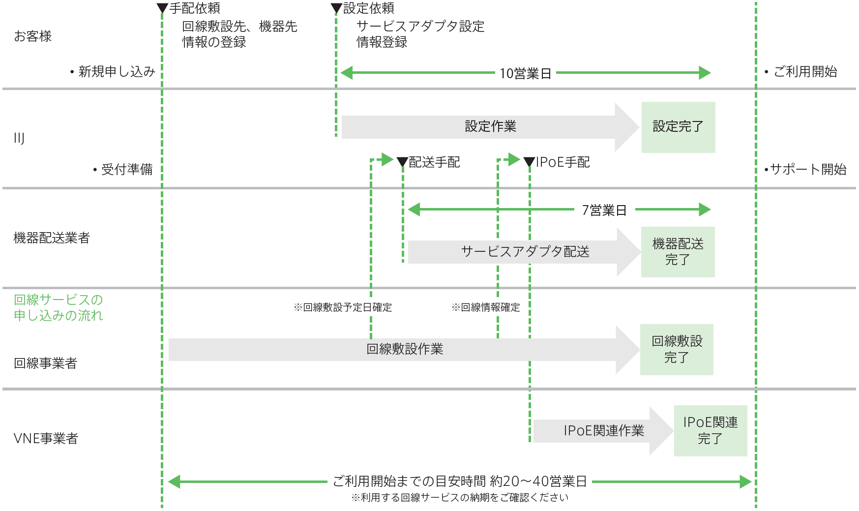 新規に回線を手配する場合は、回線事業者及びVNE事業者の手配状況により、利用開始日が希望に添えない場合があります。