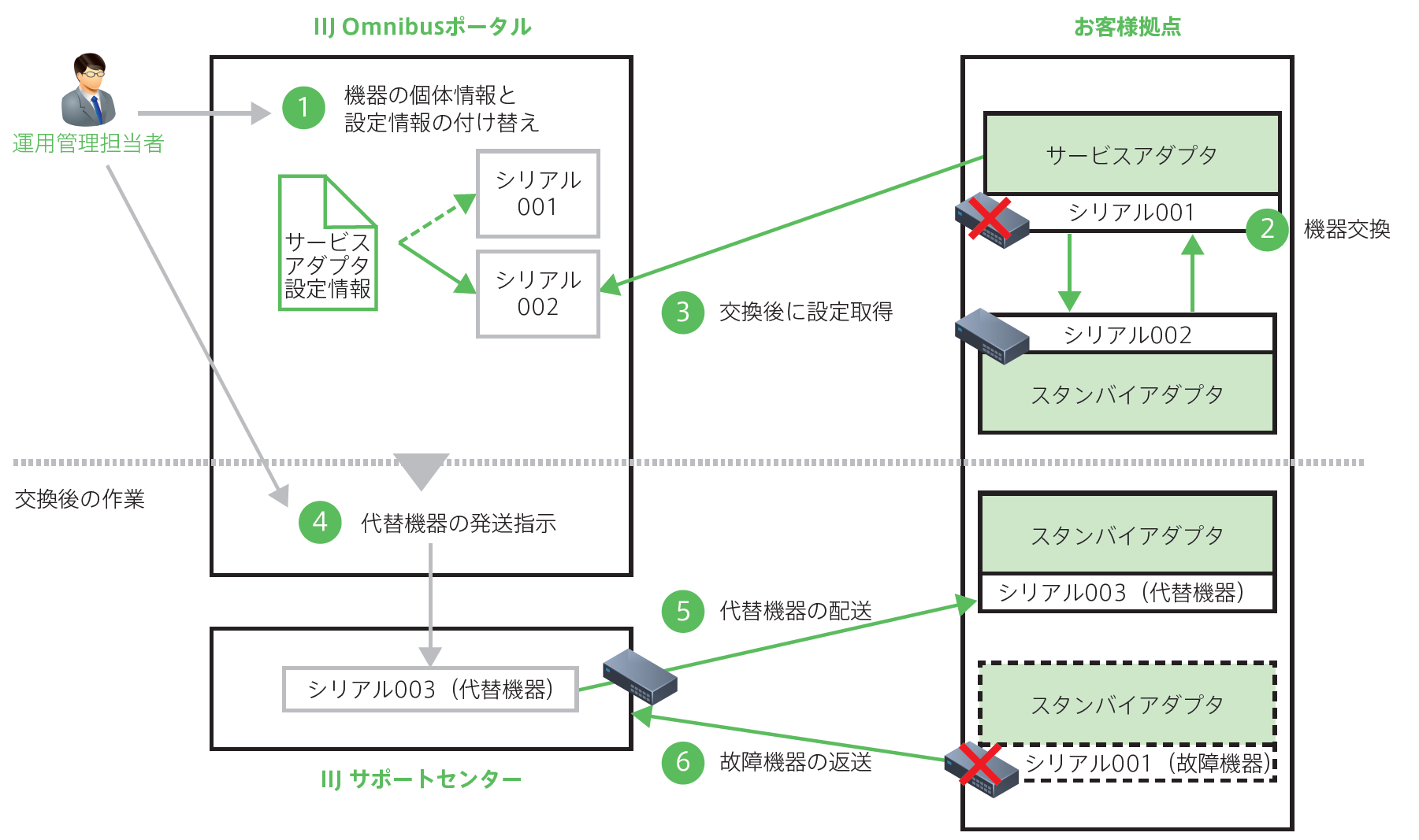 交換作業のおおまかな流れは以下のとおりです。詳しくは『IIJ Omnibusサービス マニュアル』をご覧ください。